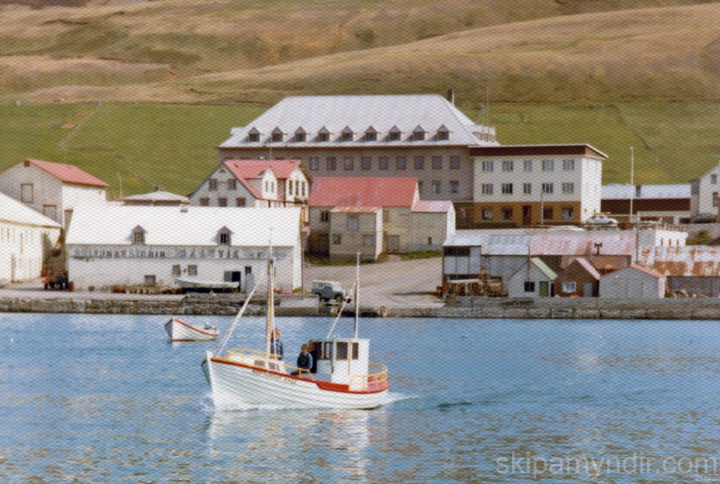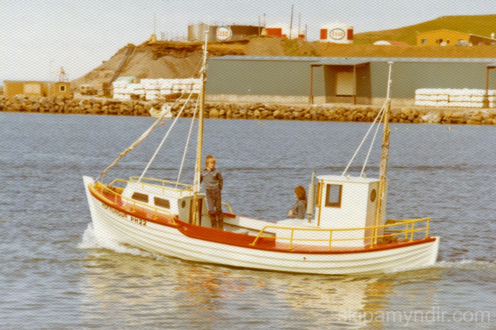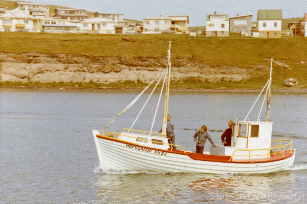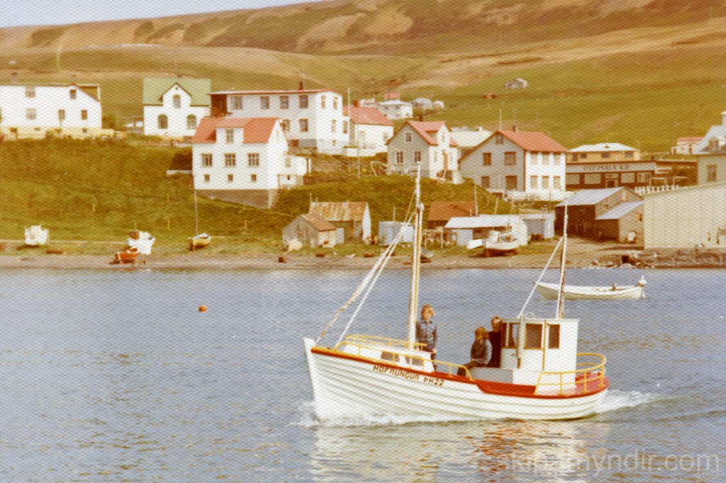 Jóhannes Straumland siglir hér Höfrungi ÞH 22 um höfnina á Húsavík og Pétur Jónasson myndar bátinn sem keyptur var til Húsavíkur árið 1974.