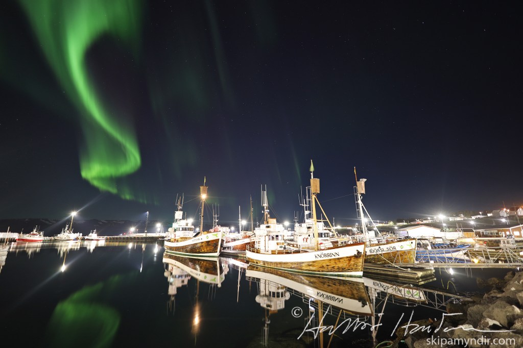 Hér má sjá Norðurljósin á himni með Norðursiglingabáta í forgrunni.