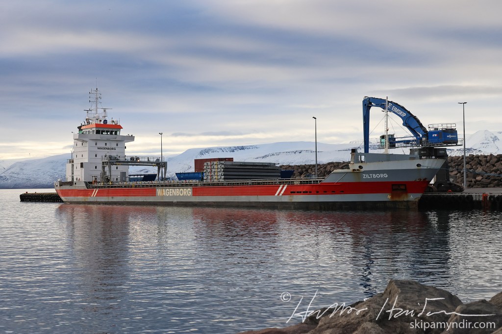 Flutningaskipið Ziltborg kom til Húsavíkur í gærkveldi þegar norðurljósin böðuðu Skjálfandaflóa með litadýrð sinni.