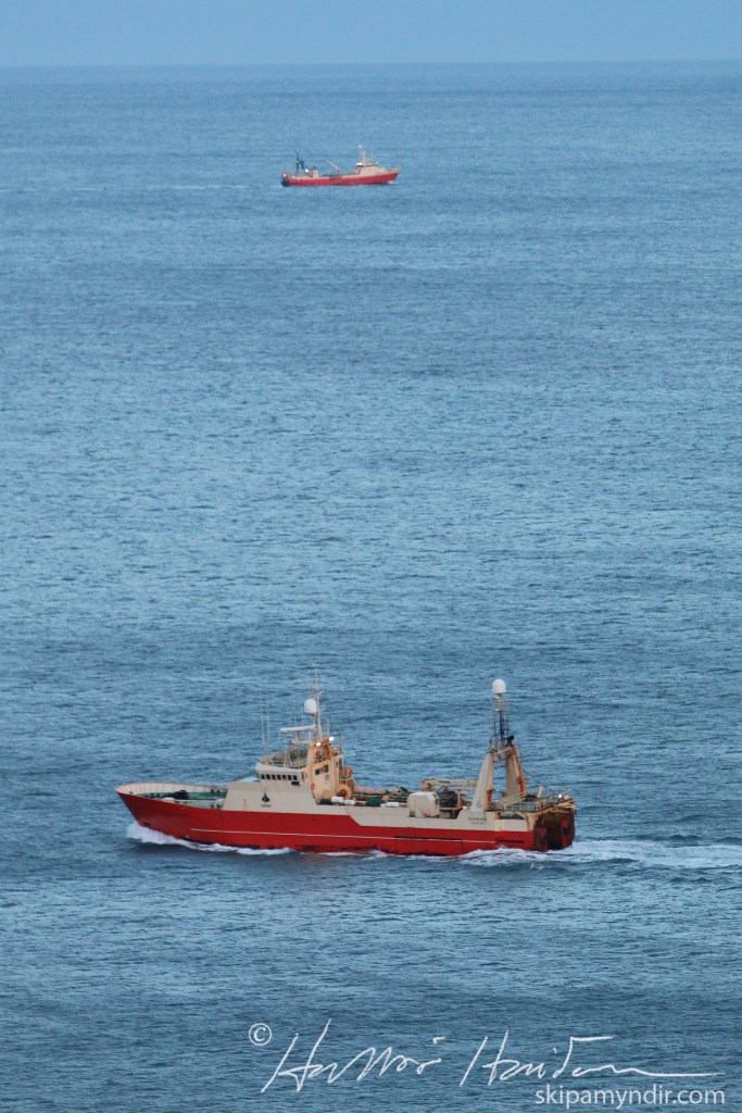 Á þessari mynd má sjá frystitogarana Sigurbjörgu ÓF 1 (nær) og Mánaberg ÓF 42 á siglingu frá Siglufirði til Ólafsfjarðar.