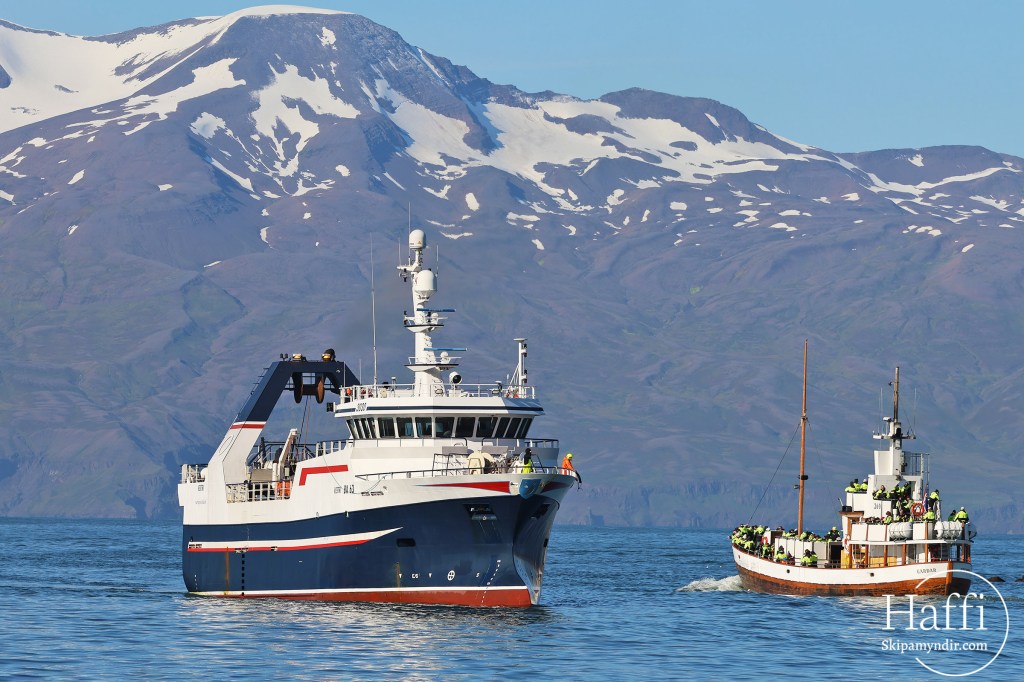 Á þessari mynd sem tekin var í ágústmánuði í fyrra mætast tvær fleytur í mynni Húsavíkurhafnar. Og þær eiga amk. eitt sameiginlegt, það er smíðaland þeirra sem er Danmörk.