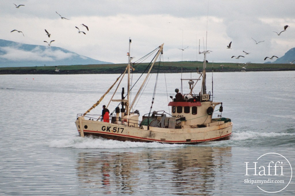 Guðbjörg GK 517 kemur hér að landi í Reykjavík um árið en þar átti báturinn lengi heimahöfn sem Rúna RE 150.