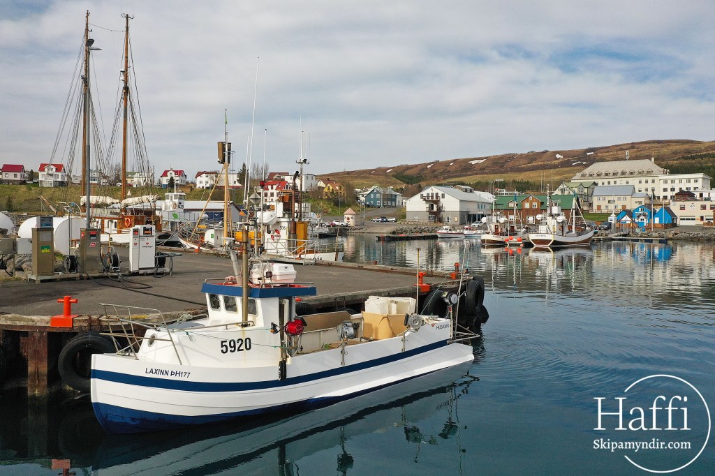Strandveiðibáturinn Laxinn við bryggju á Húsavík nú síðdegis, Reynir Hilmars að taka olíu fyrir næsta róður.