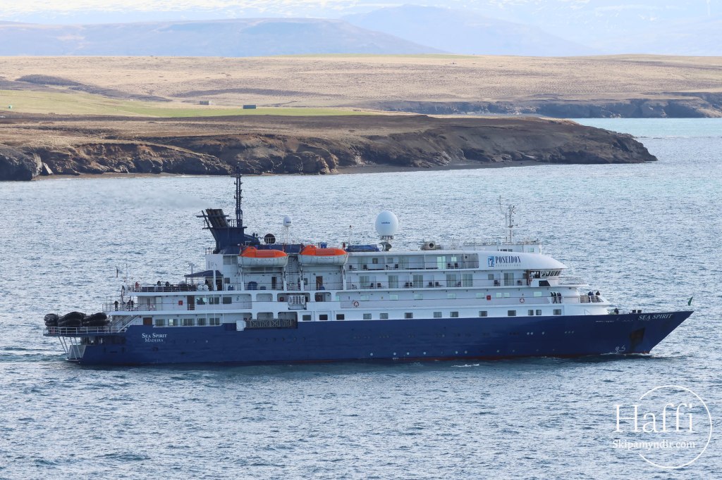 Skemmtiferðaskipið Sea Spirit hafði viðkomu á Húsavík í dag og var þessi mynd tekin er það lét úr höfn síðdegis.