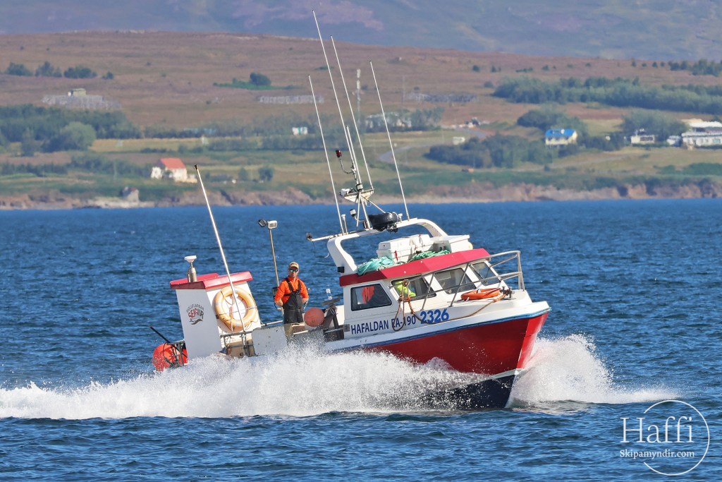 Grímseyjarbáturinn Hafaldan EA 190 kemur hér að landi á Dalvík í dag en báturinn tók þátt í sjóstangveiðimóti um helgina.
