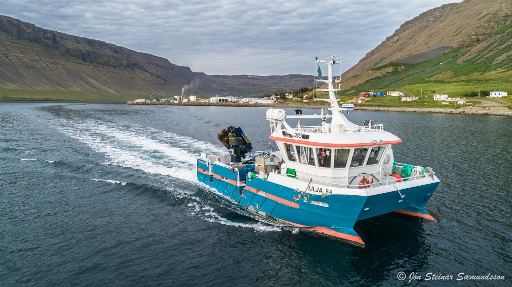 Lilja BA siglir hér frá Bíldudal og út á Arnarfjörðinn en þar eru fiskeldiskvíar sem báturinn þjónar.