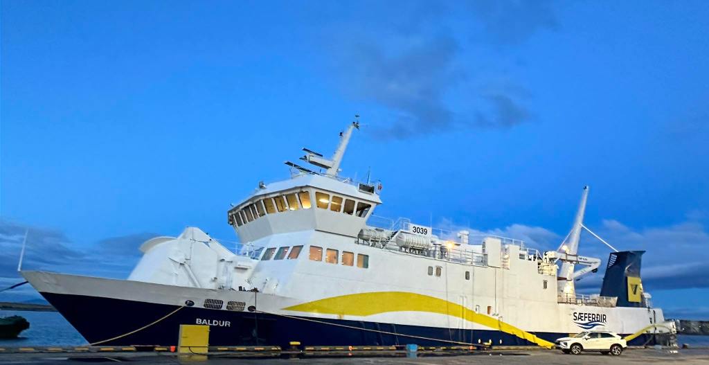 Breiðafjarðarferjan Baldur fór niður úr dokkinni í Hafnarfirði í dag og tók Maggi Jóns þessa mynd af henni við bryggju.