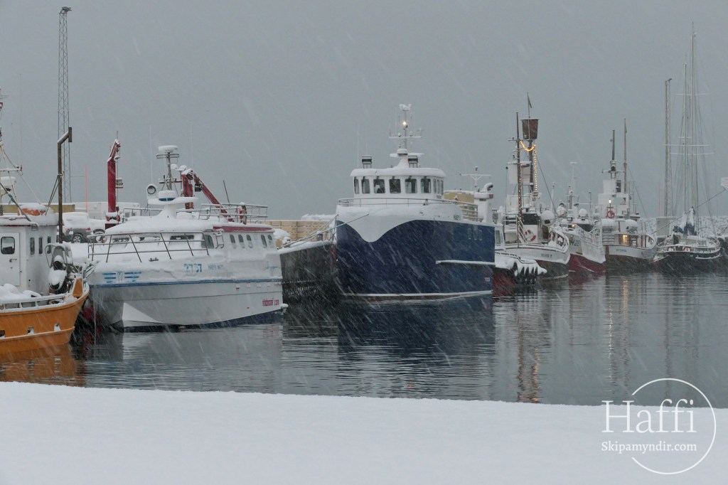 Þarna má sjá nokkra báta liggja við Suðurgarðinn í Húsavíkurhöfn.