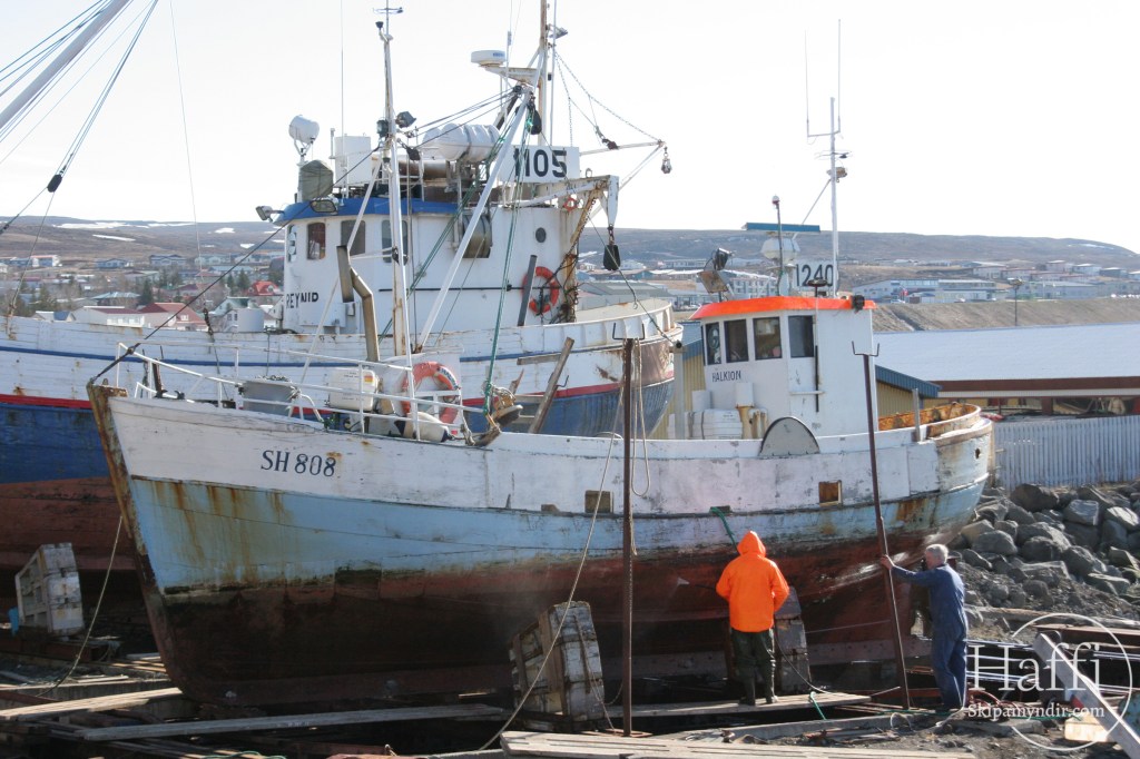Hér gefur að líta eikarbátinn Halkion SH 808 í slipp á Húsavík sumarið 2005 en þá var nýbúið að kaupa bátinn til Þórshafnar á Langanesi.
