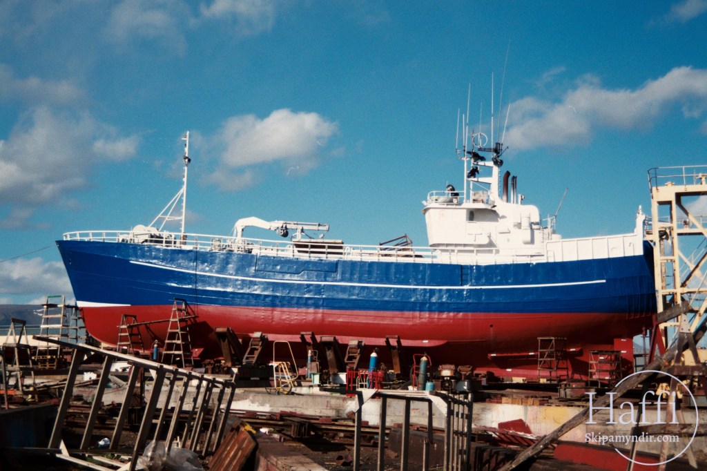 Hérna er Nói EA 477 að breytast í Brynjólf ÁR 3 í slippnum á Akureyri en það var árið 1995.