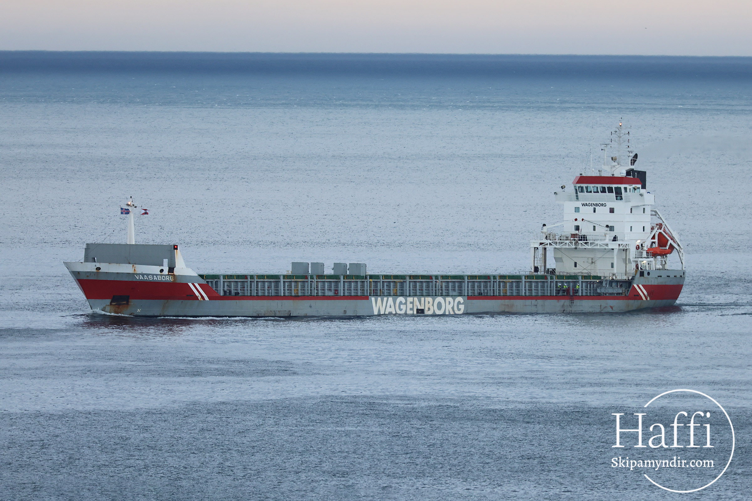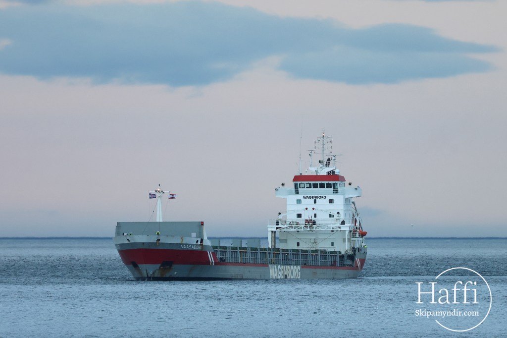 Hollenska flutningaskipið Vaasaborg kom til Húsavíkur nú undir kvöld og lagðist að Bökugarðinum.