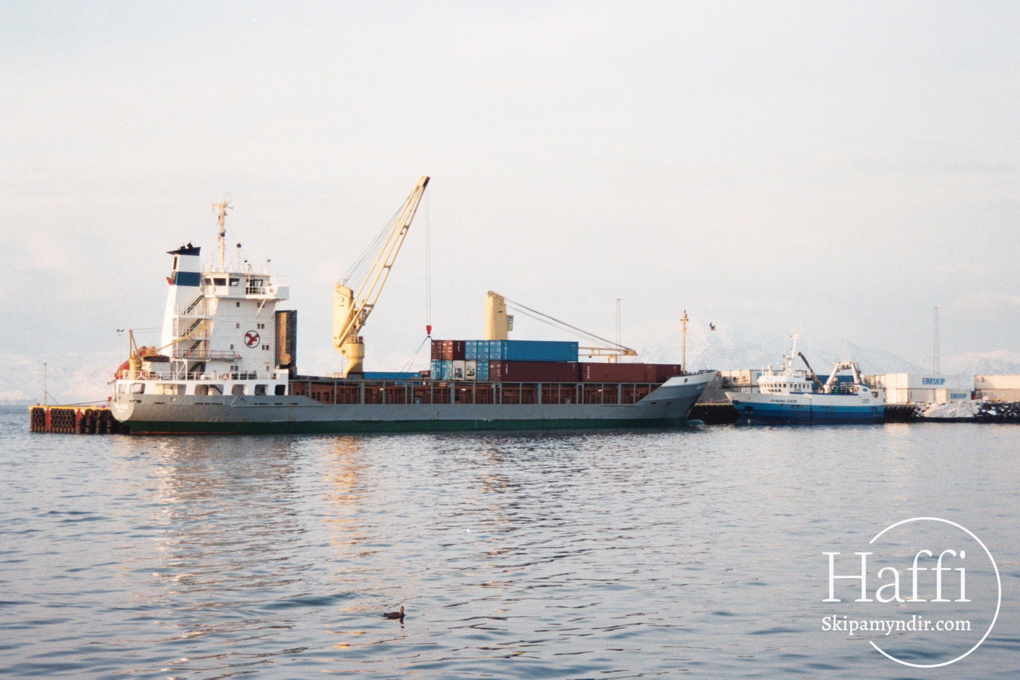 Hér gefur að líta Múlafoss og Eyborgina úr Hrísey við hafnargarðinn á Húsavík sem kallaður var en heitir Norðurgarður.