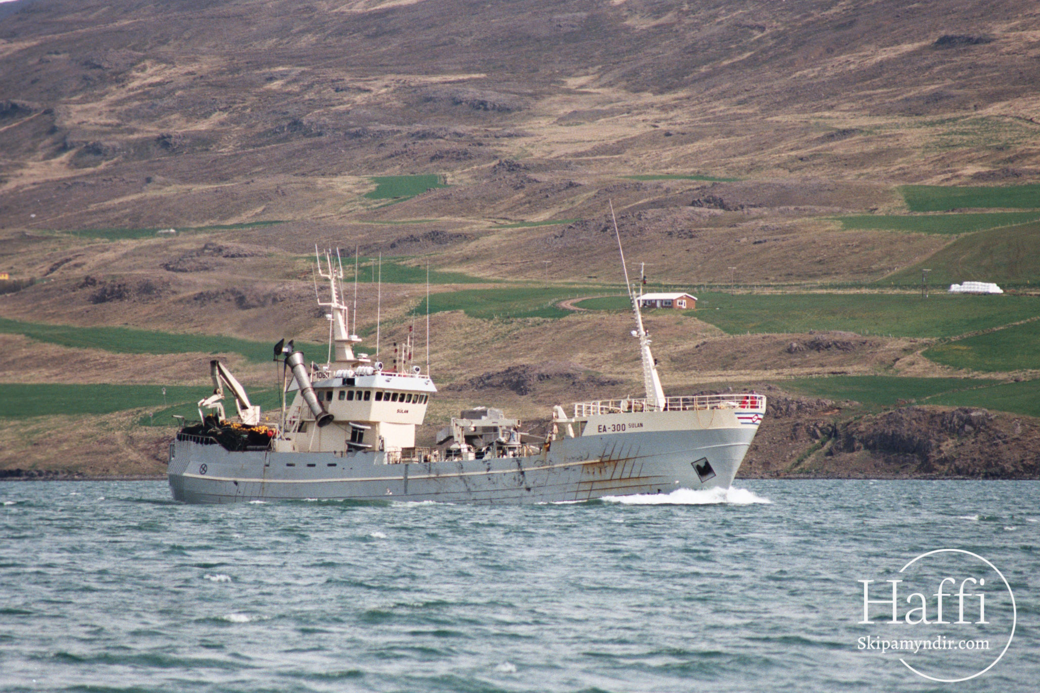 Súlan EA 300 siglir hér inn Eyjafjörð með heimahöfn sína Akureyri sem áfangastað.