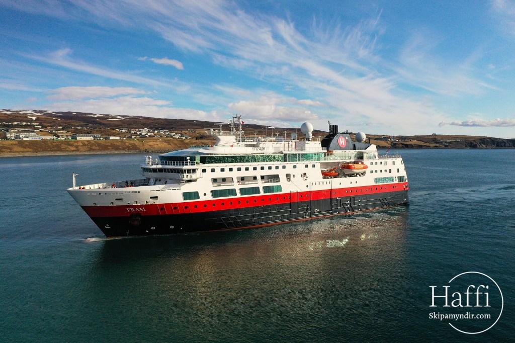 Fram, sem einnig var fyrst skipa á ferðinni hér á síðasta vor, er gert út af fyrirtækinu Hurtigruten og er með heimahöfn í Tromsö.