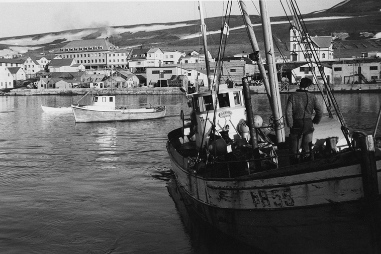 Sæborg ÞH 55 er að leggjast að bryggju og fjær er frambyggð trilla sem mér sýnist standa EA á.