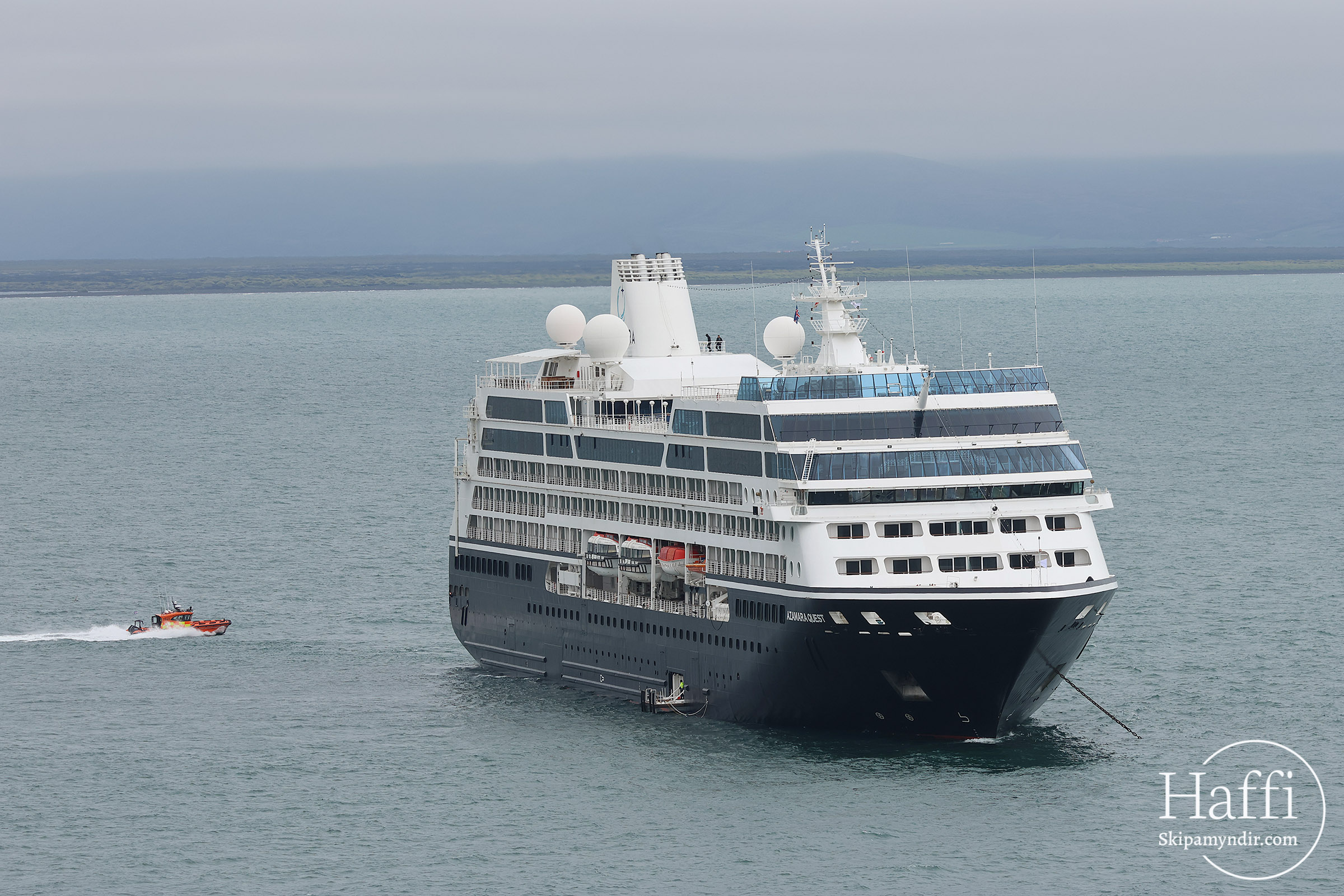 Farþegaskipið Azamara Quest liggur við akkeri, eða ankeri eins og sumir segja, framundan Húsavíkurhöfða í dag og farþegar þess fluttir í land á léttbátum skipsins.