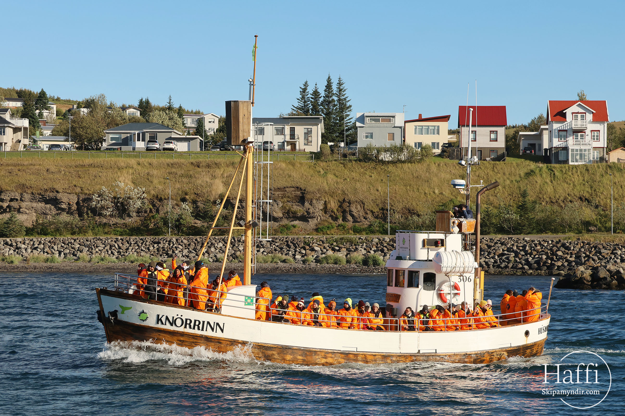 Knörrinn leggur hér upp í hvalaskoðunarferð á Skjálfanda í morgun.
