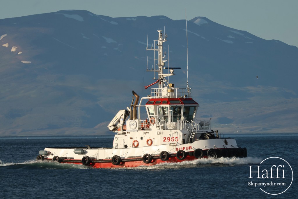 Hafnsögubáturinn Seifur hafði í nógu að snáust sl. laugardag og hér siglir frá Krossanesi inn að Eimskipsbryggjunni í næsta verkefni.