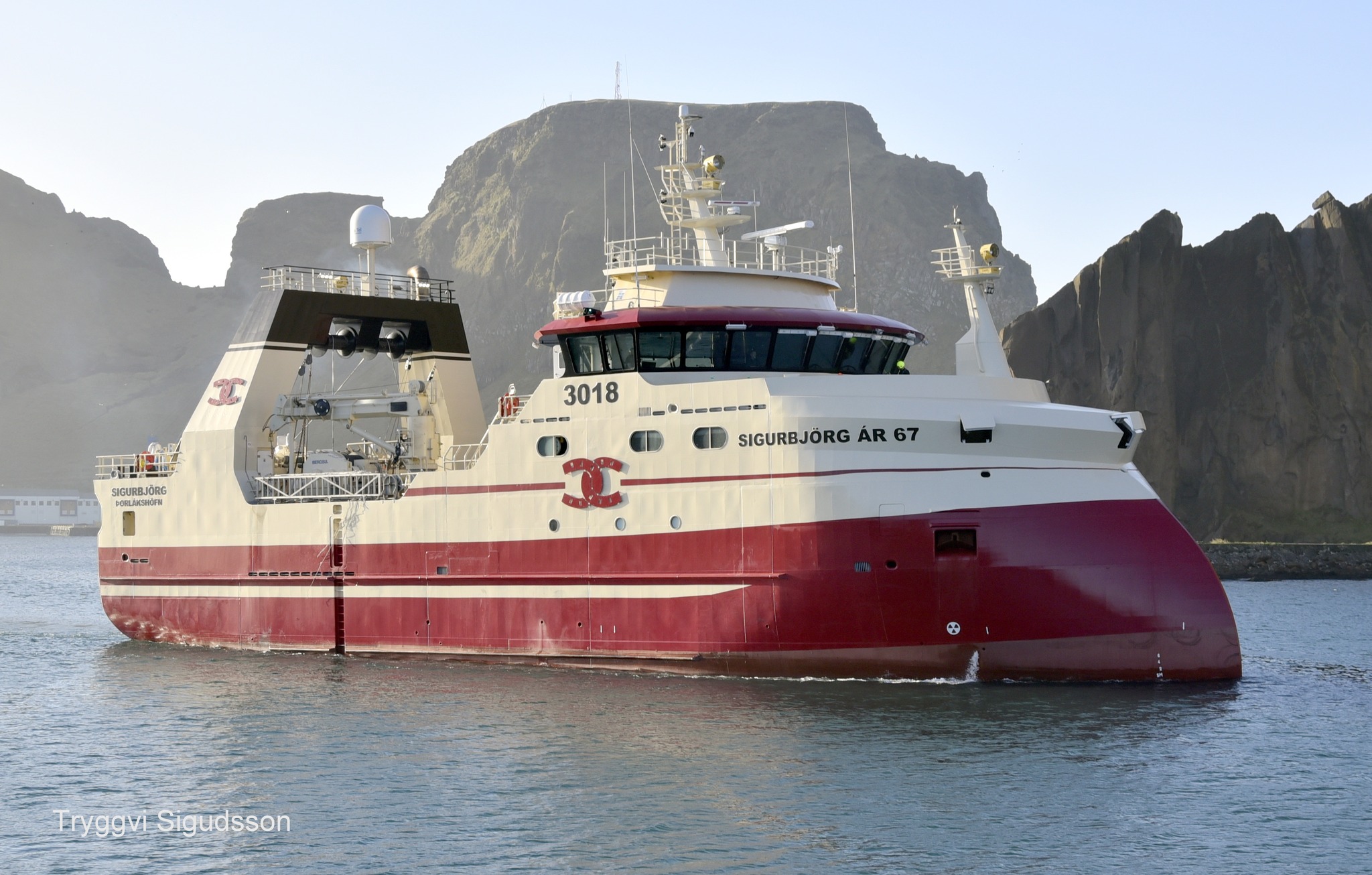 Sigurbjörg ÁR 67, nýjasta skip Ísfélagsins, landaði í fyrsta skiptið í Vestmannaeyjum í vikunni og tók Tryggvi Sigurðsson þessa mynd þegar hún hélt aftur til veiða í gær.