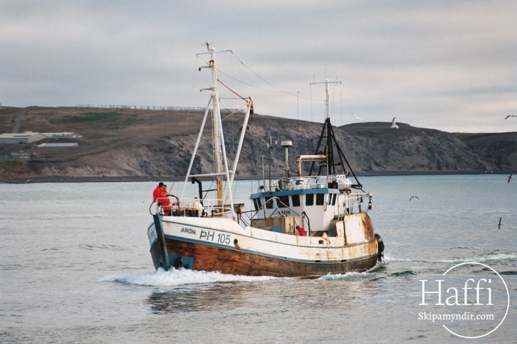 Aron ÞH 105 kemur hér að landi á Húsavík eftir dragnótaróður á Skjálfanda um árið.