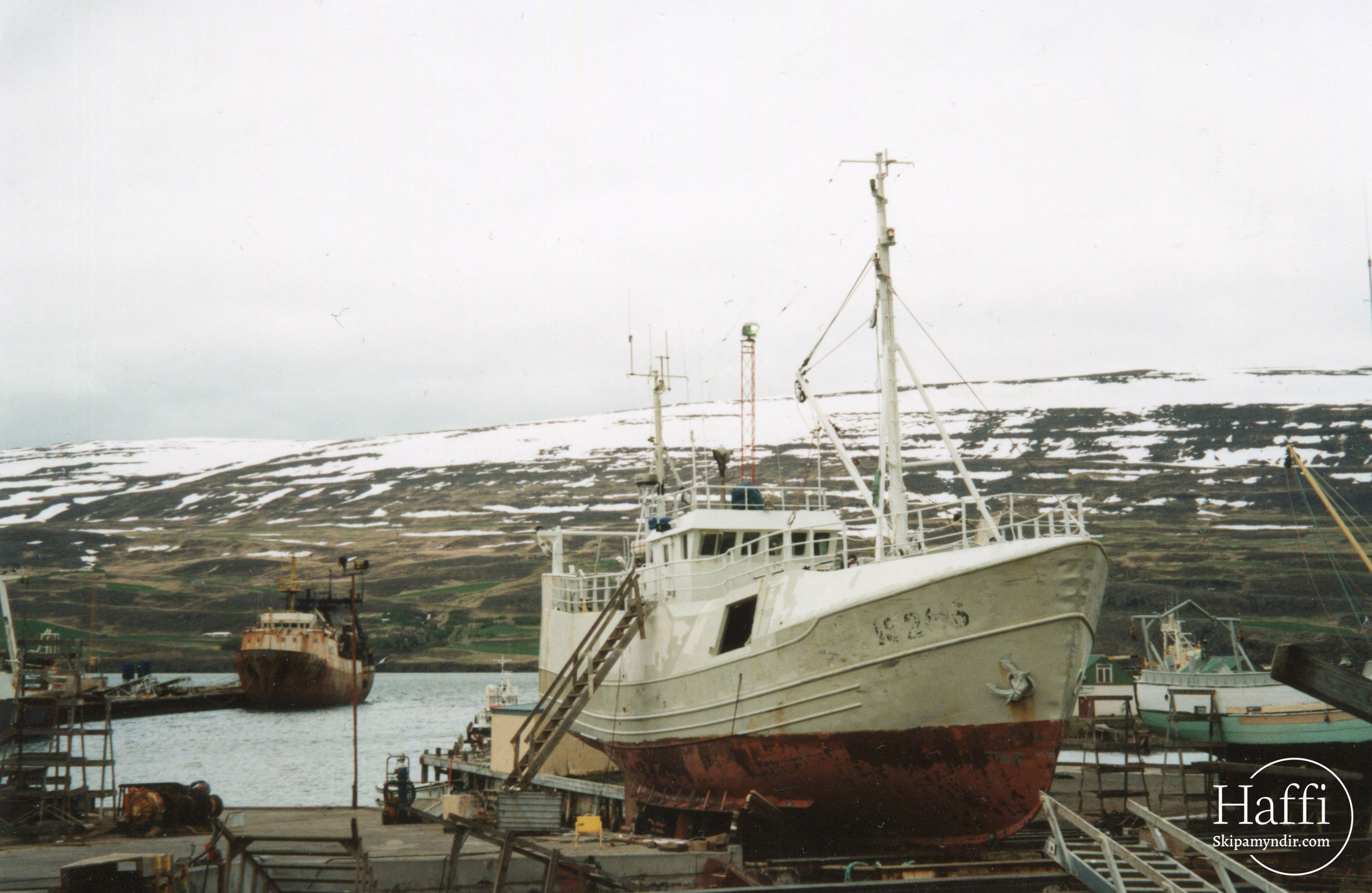 Guðný ÍS 266 er hér í slipp á Akureyri um árið en upphaflega hét báturinn Sunnutindur SU 59 frá Djúpavogi.