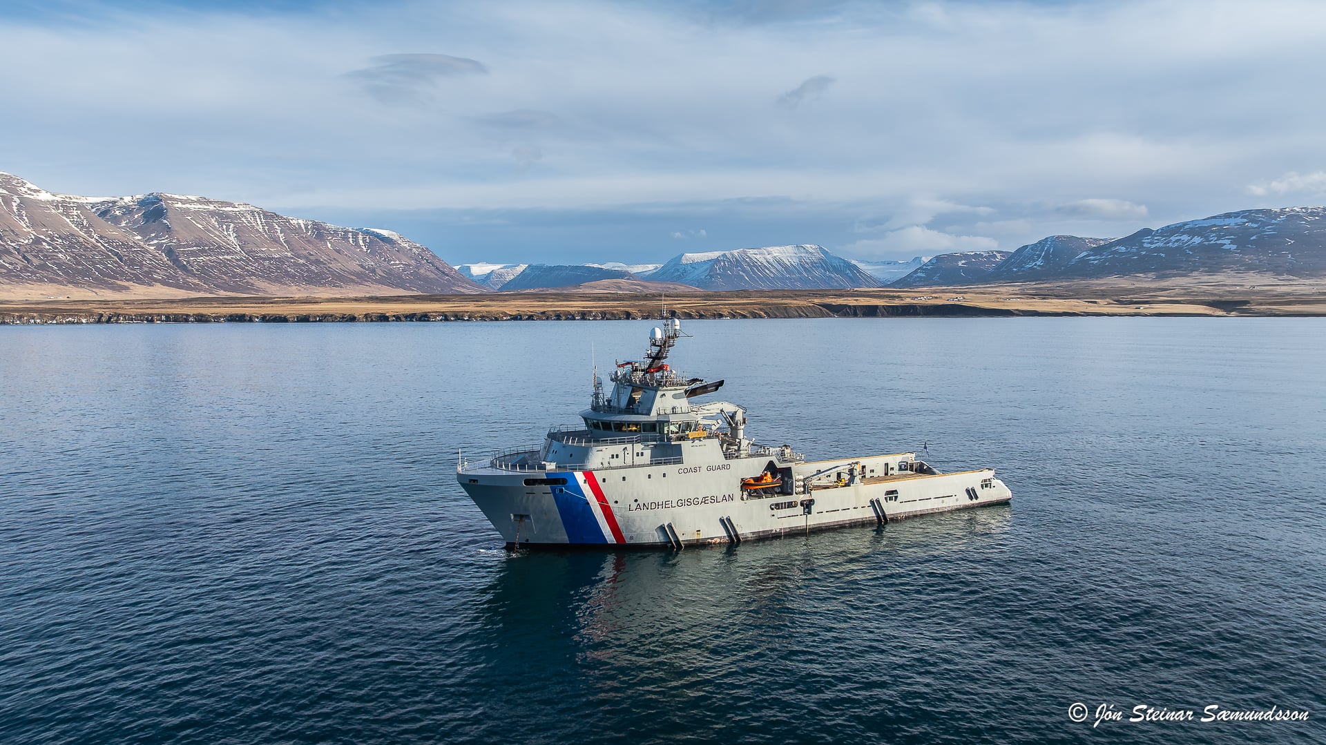 Jón Steinar tók þessa mynd af varðskipinu Freyju í gær þar sem skipið lá fyrir akkeri fyrir mynni Hjaltadals inni á Skagafirði.