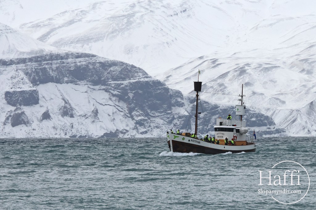 Náttfari kemur hér úr fyrstu hvalaskoðunarferð ársins frá Húsavík sl. mánudag en það er Norðursigling sem gerir bátinn út.