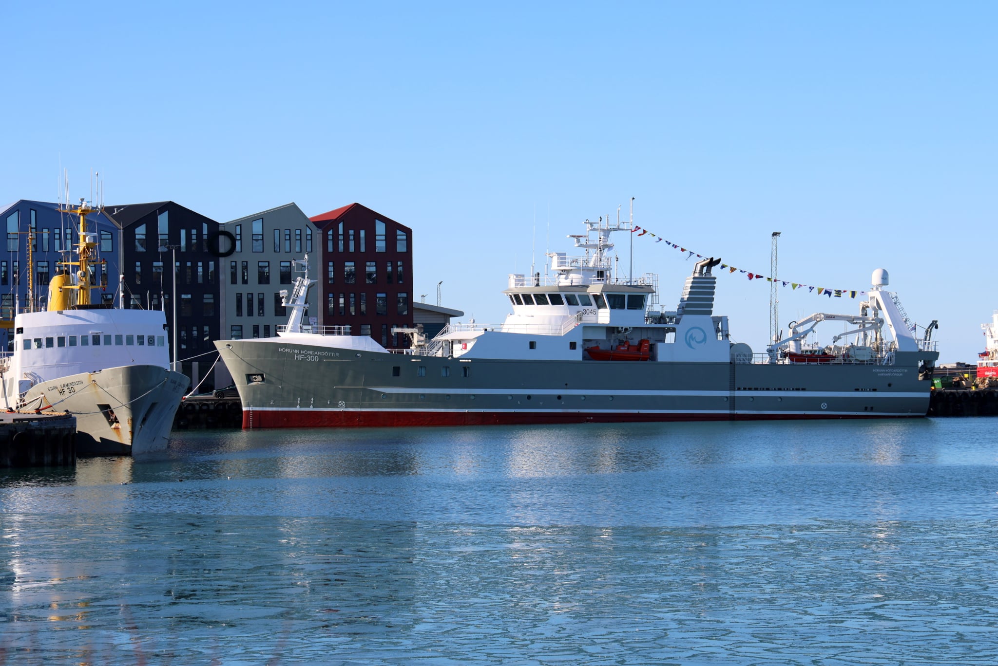 Hér liggja hafrannsóknarskipin Bjarni Sæmundsson HF 30 og Þórunn Þórðardóttir við bryggju í Hafnarfirði.