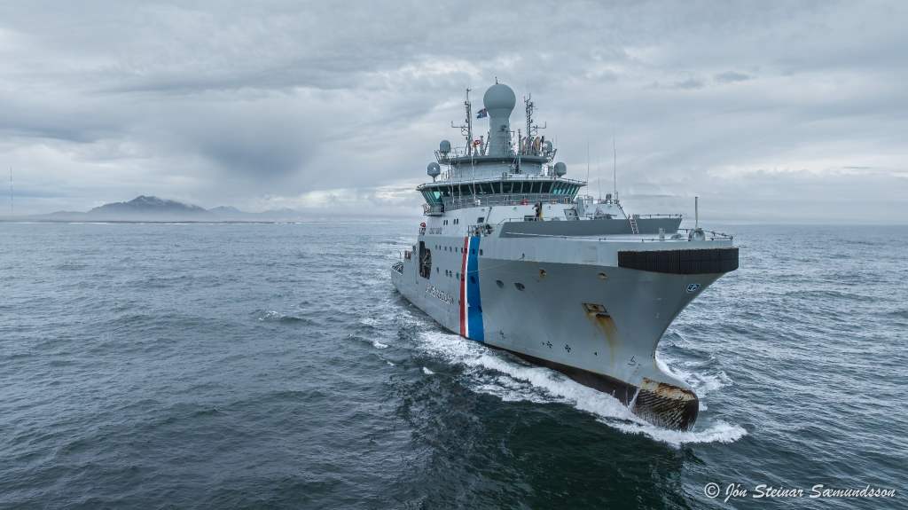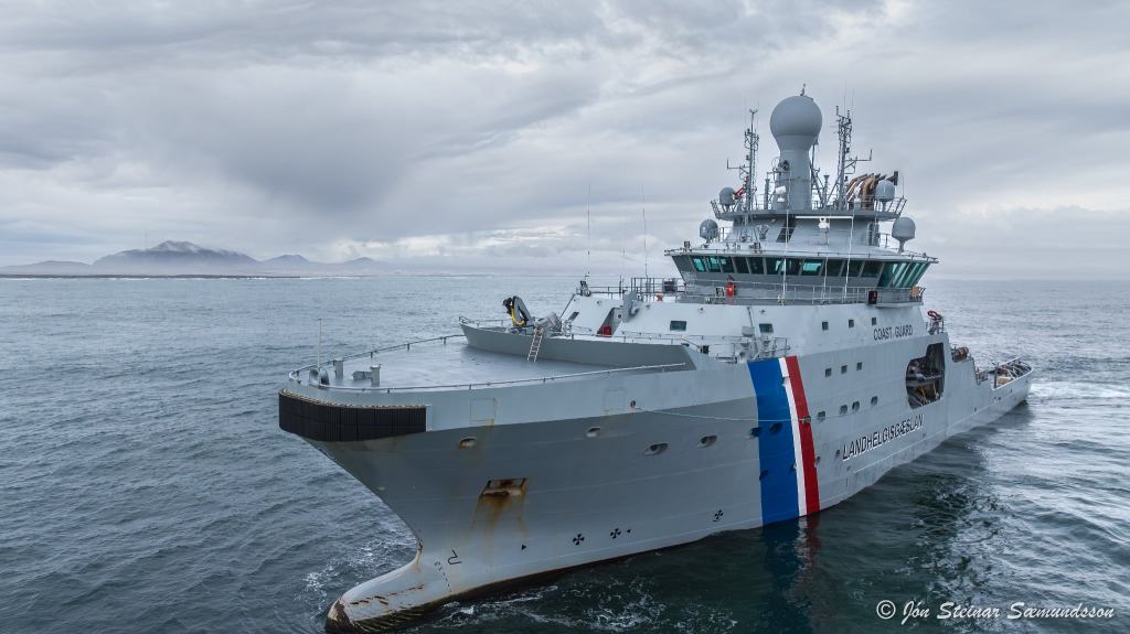 Varðskipið Þór lónaði í stutta stund utan við Grindavík í gær og flaug Jón Steinar drónanum út yfir hann.