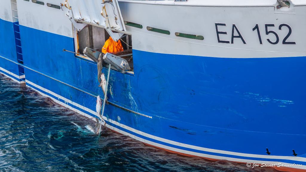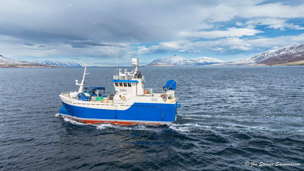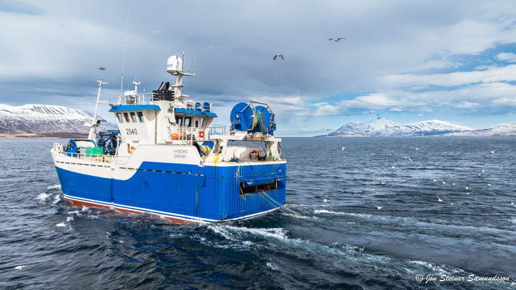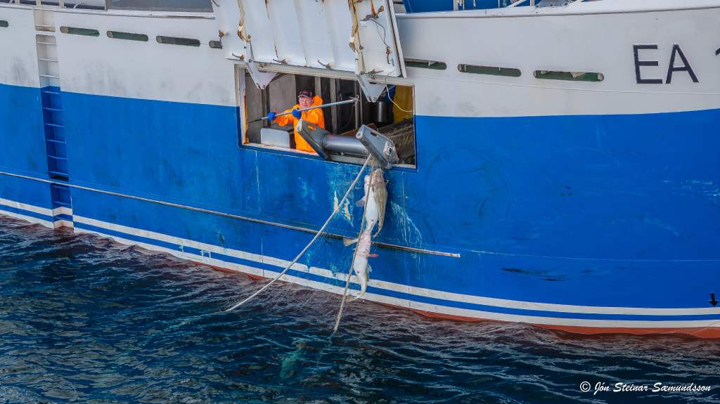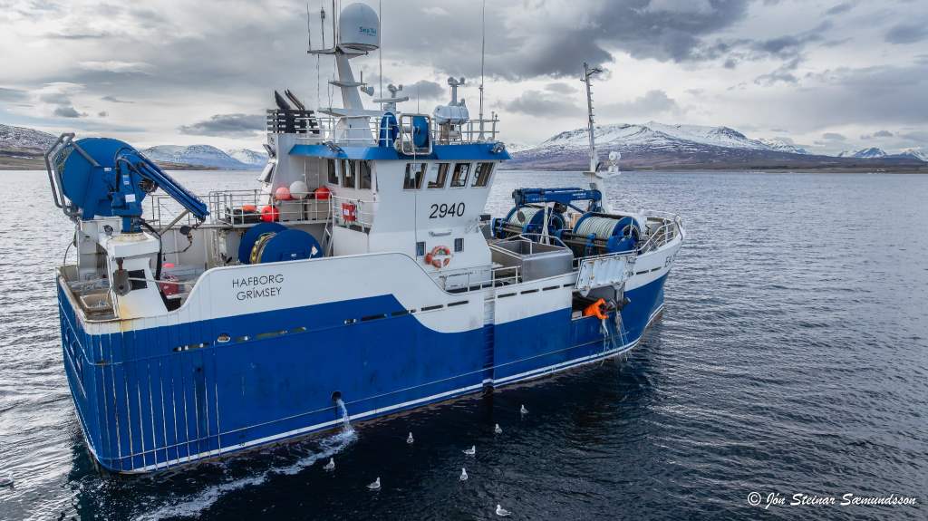 Það var að sögn skipstjórans á Hafborgu frekar dræm veiði í dag. Skást var það í þessa trossu sem þeir voru að draga þegar undirritaður flaug drónanum yfir eða um 3 tonn. í sumar af hinum trossunum var aflinn allt niður í 10-15 fiska.