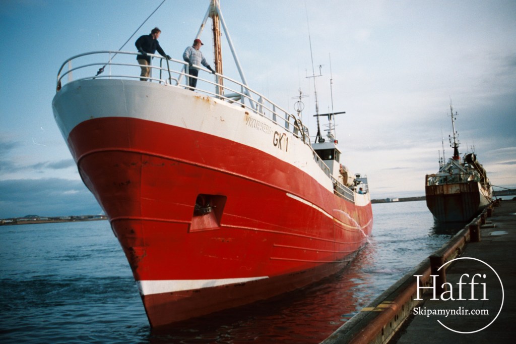 Loðnuskipið Víkurberg Gk 1 kemur hér að bryggju í Njarðvík um árið en það voru Benóný Þórhalsson og Reynir Jóhannsson sem gerðu skipið út.