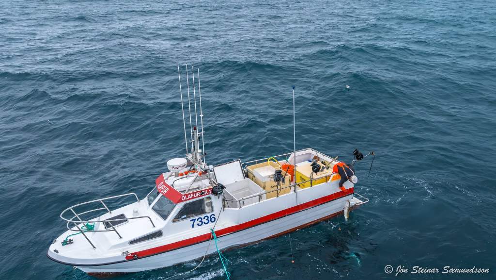 Hér er Ólafur GK 133, nýjasti strandveiðibátur Grindvíkinga, á skaki úti fyrir Hópsnesi við Grindavík í gær en Eiríkur Dagbjartsson gerir hann út í gegnum fyrirtæki sitt Grindjáni ehf.