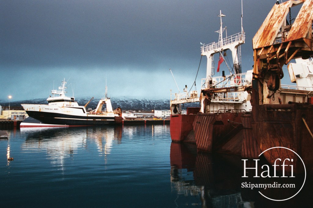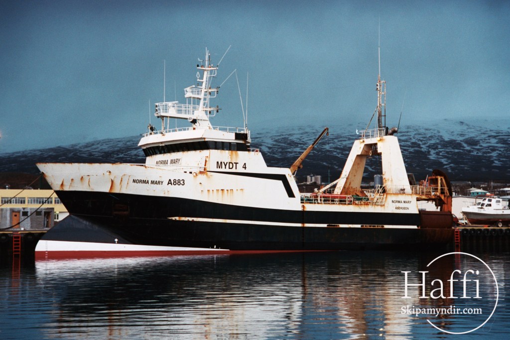 Hér liggur frystitogarinn Norma Mary A 883 við bryggju um árið en upphaflega hét hann Snæfugl SU 20.