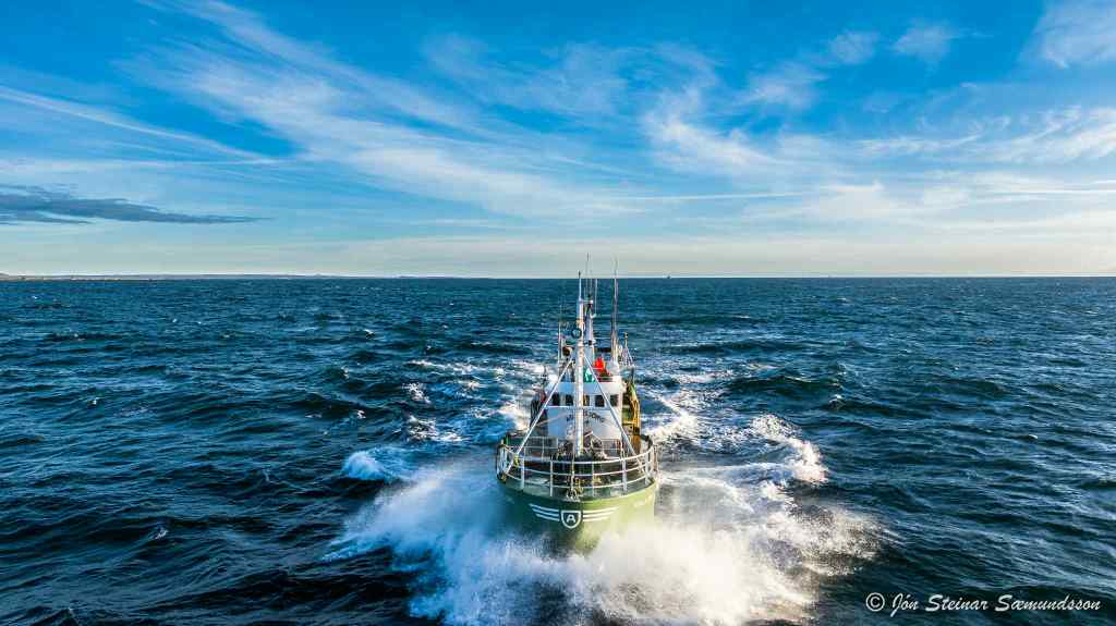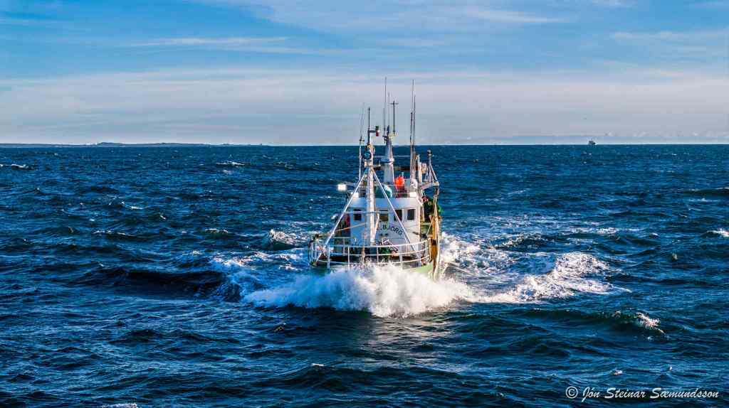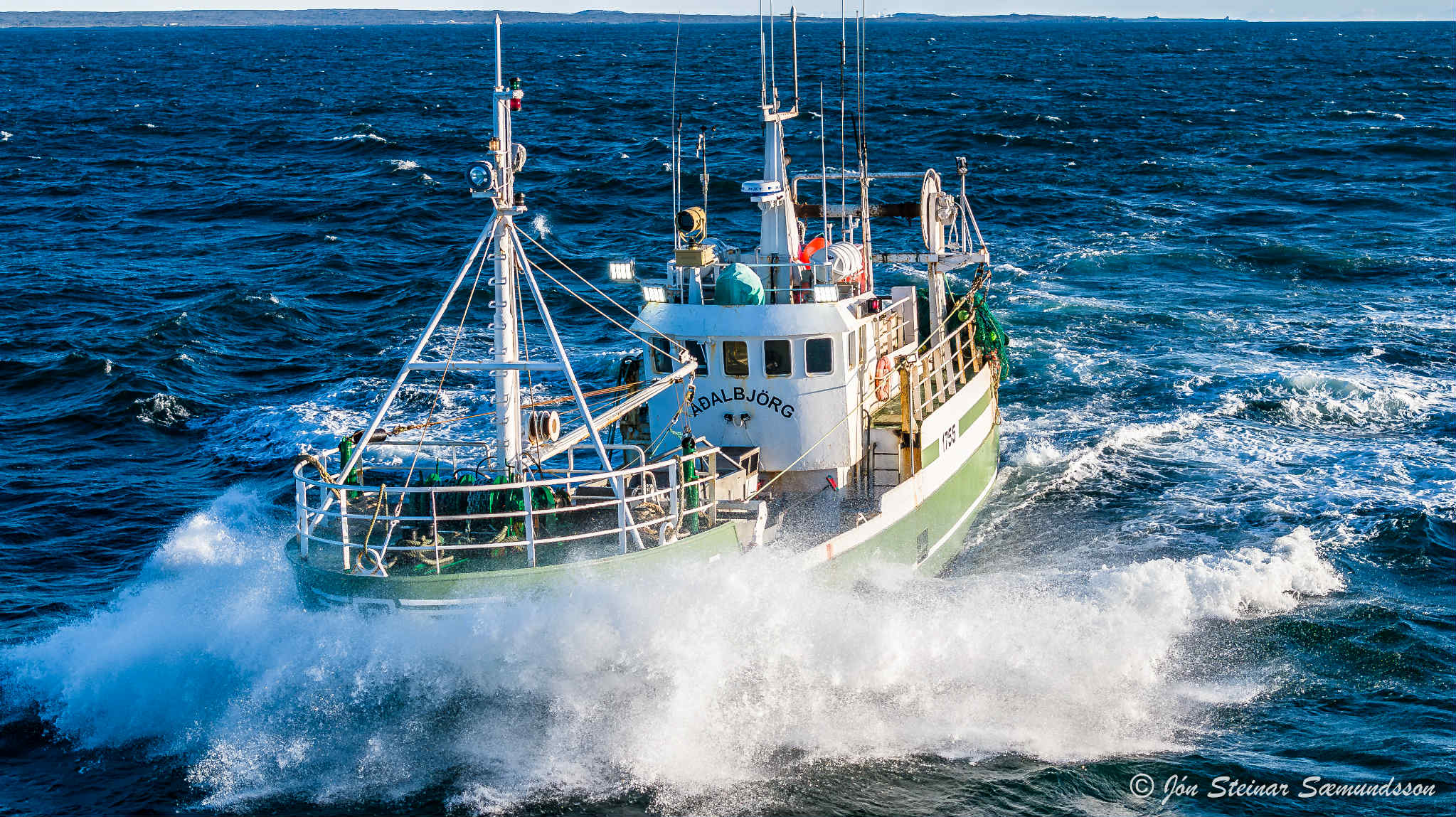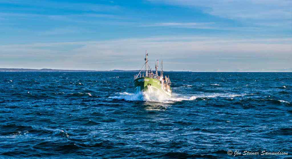 Jón Steinar tók þessar myndir í vikunni en þær sýna Aðalbjörgina RE 5 ösla á móti norðanbárunni á leið til hafnar í Sandgerði.