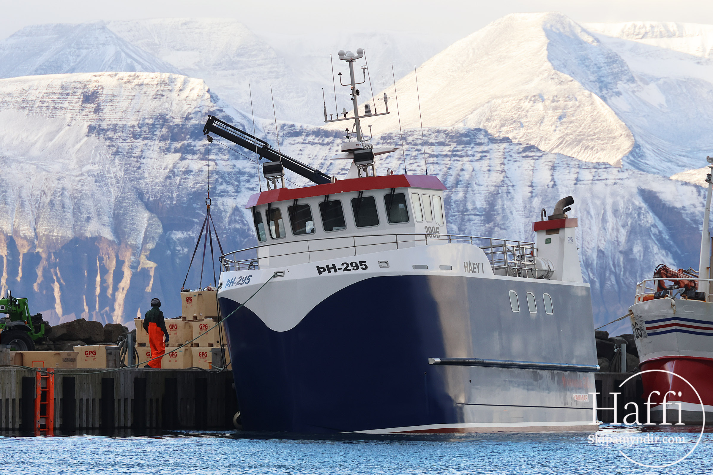 Línubátur GPG Seafood, Háey I ÞH 295, kom til löndunar á Húsavík í morgun og eins og sjá má hefur gránað í fjöll við Skjálfanda.