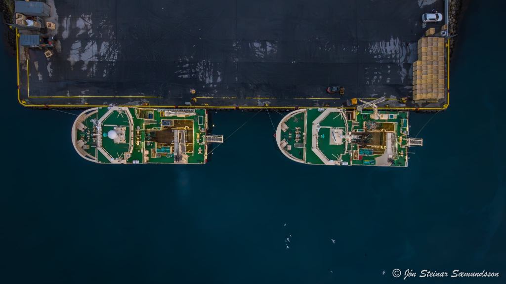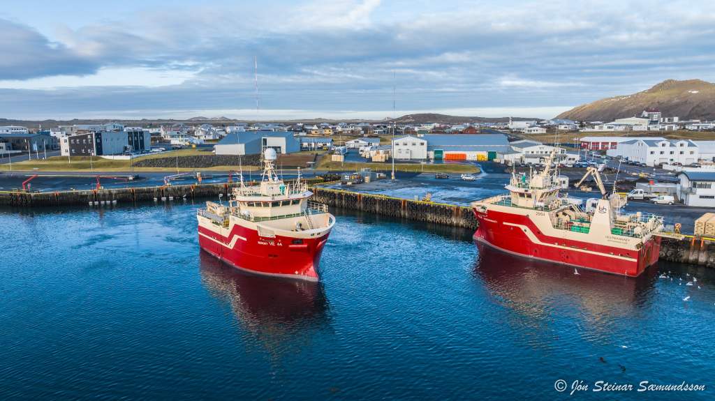 Systurnar Vestmannaey og Bergey komu til löndunar í Grindavík í bítið í gærmorgun. Þær voru kallaðar inn þar sem vantaði hráefni í vinnsluna hjá Vísi.