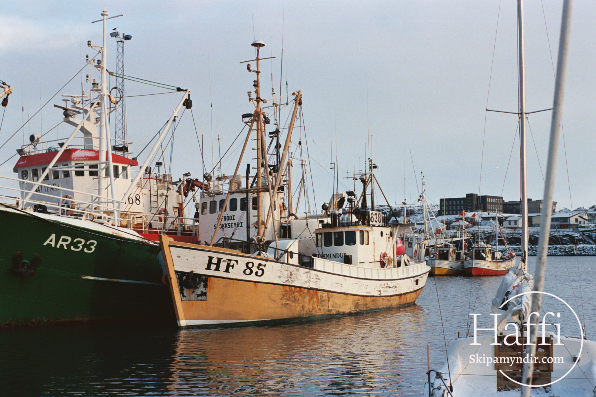 Sæmundur HF 85, sem liggur hér utan á Fróða ÁR 33 í Hafnarfjarðarhöfn um árið, hét upphaflega Björgvin EA 311 frá Dalvík.