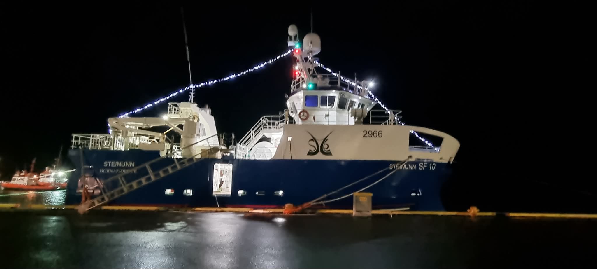 Steinunn SF 10 kom til löndunar í Þorlákshöfn í gærmorgun og áður en áhöfnin hélt til síns heima var jólaserían sett upp.