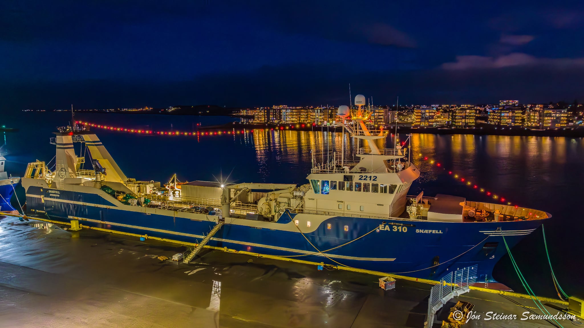 Jón Steinar tók þessa mynd af Samherjatogaranum Snæfelli EA 310 þar sem það liggur ljósum prýtt í Hafnarfjarðarhöfn.