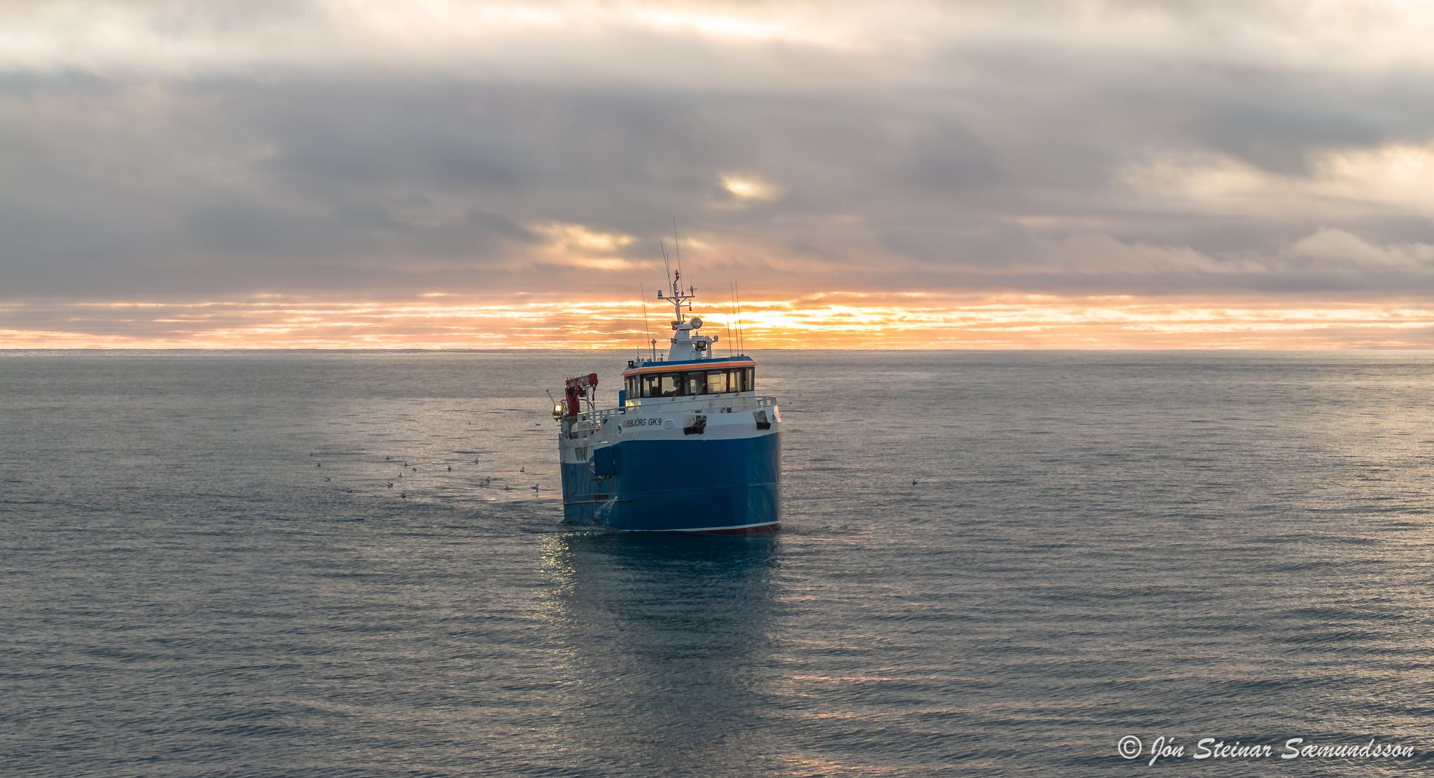 Jón Steinar tók þessar myndir í gær en þær sýna línubátinn Guðbjörgu GK 9 draga línuna undan Selatöngum austan Grindavíkur.
