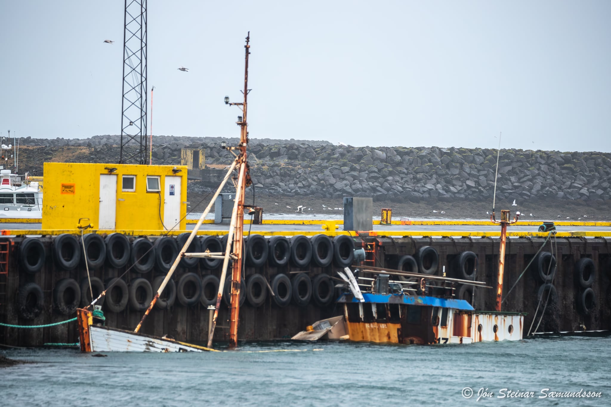Hér gefur að líta Dúfu RE 400 á mynd Jóns Steinars frá því um heligna þar sem hún liggur sokkin við bryggju í Grindavík.