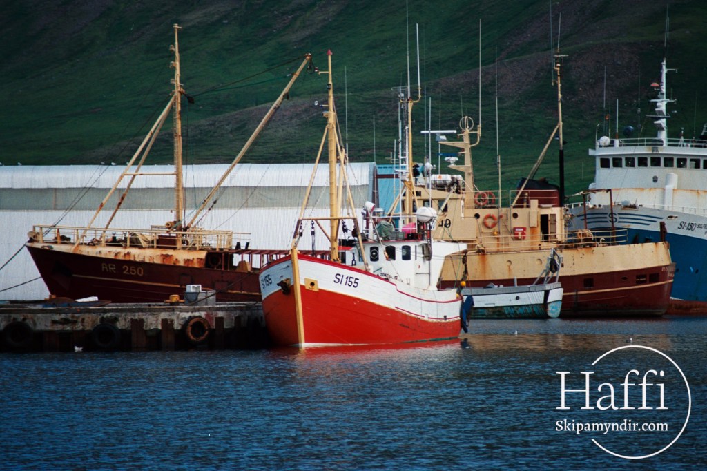 Á þessari mynd sem tekin var á Siglufirði 1988 eða níu má sjá fremsta Guðrúnu Jónsdóttur SI 155 sem upphaflega hét Jón Helgason ÁR 12.
