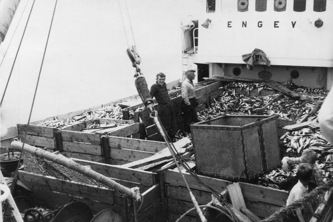 Á þessari mynd sem framkölluð var í júlímánuði árið 1964 sést hvar verið er að landa síld úr Engey RE 11 og það að öllum líkindum á Húsavík.