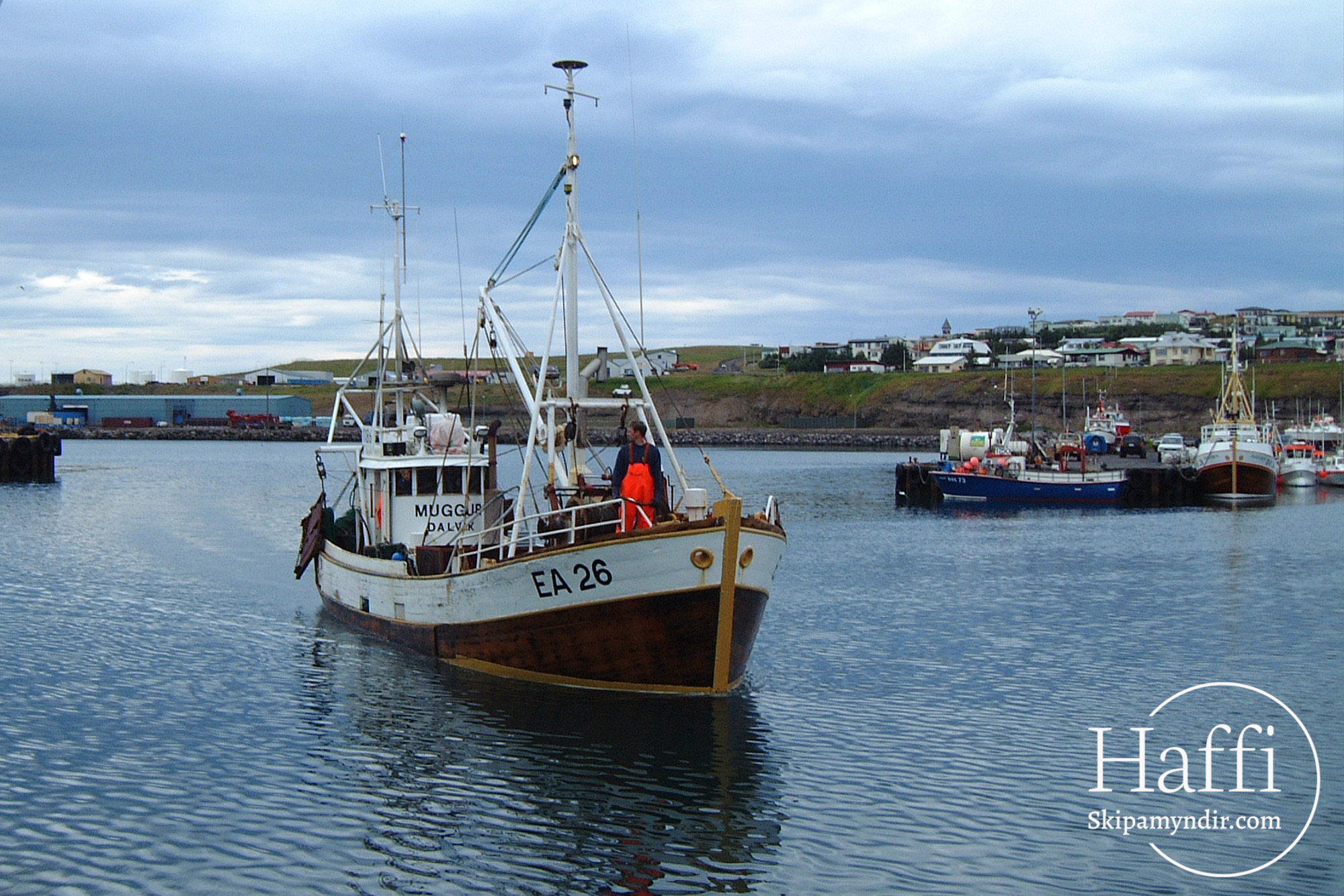 Muggur EA 26, sem kemur hér að bryggju á Húsavík sumarið 2000, var smíðaður í Slippstöðinni á Akureyri árið 1971 fyrir Dalvíkinga og hét upphaflega Bliki EA 12.
