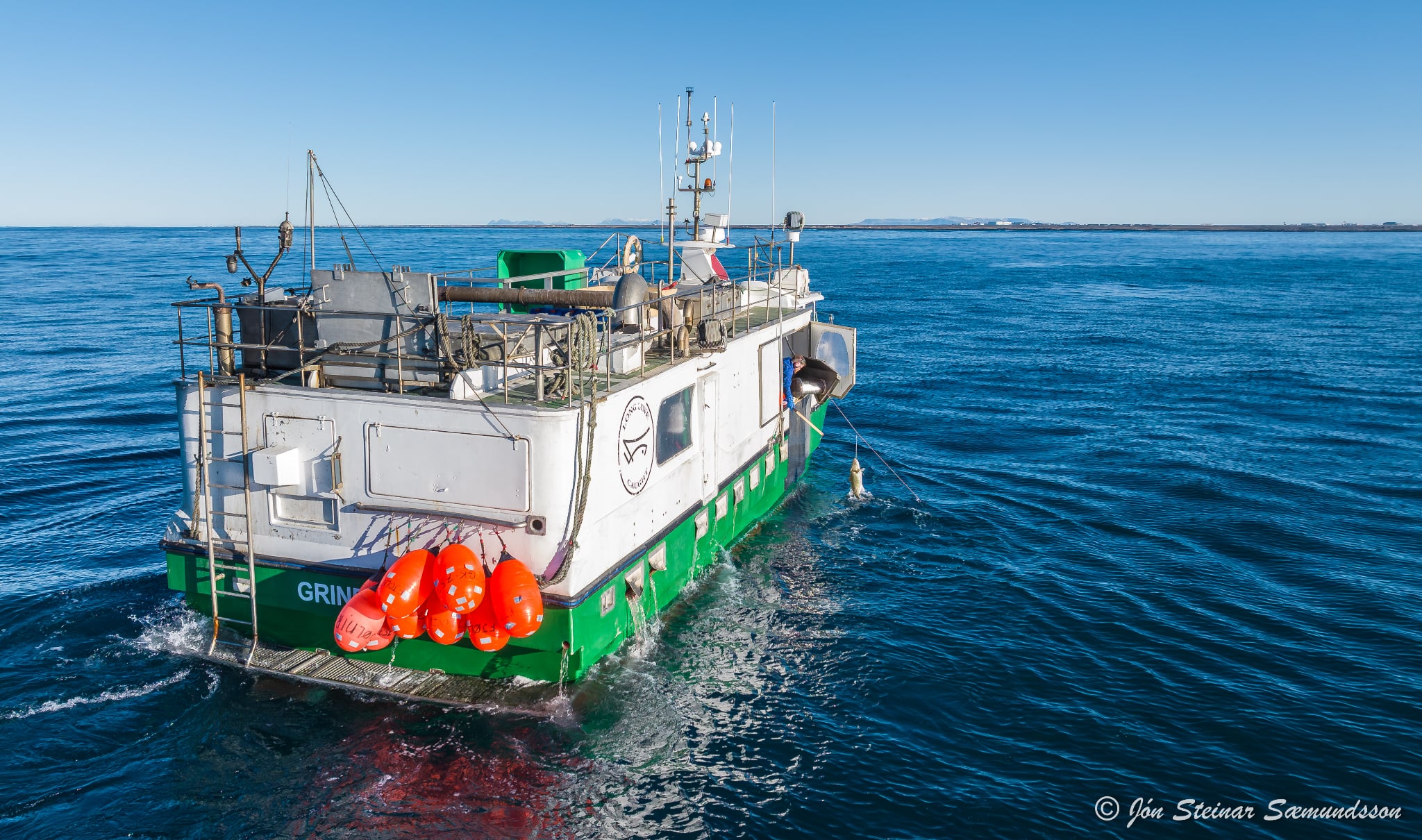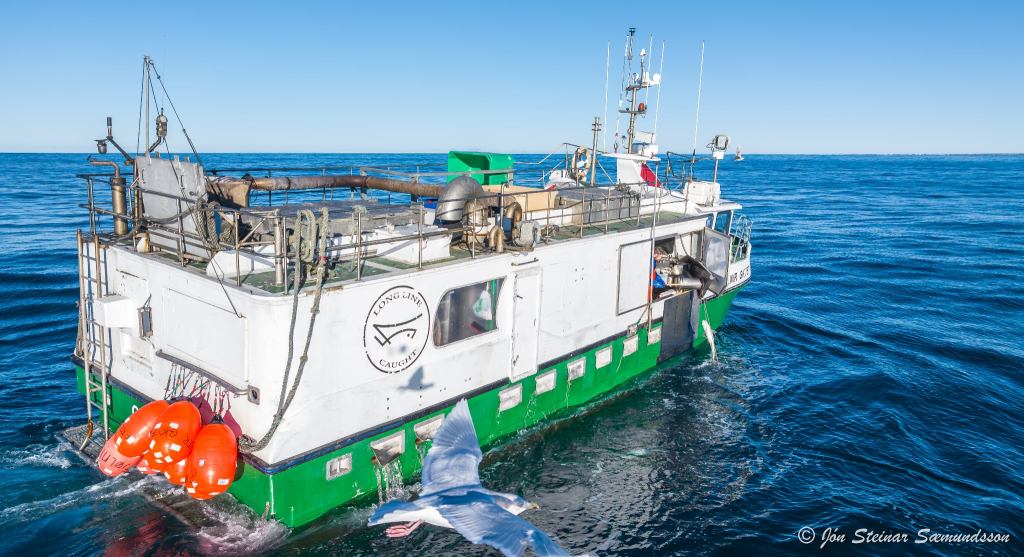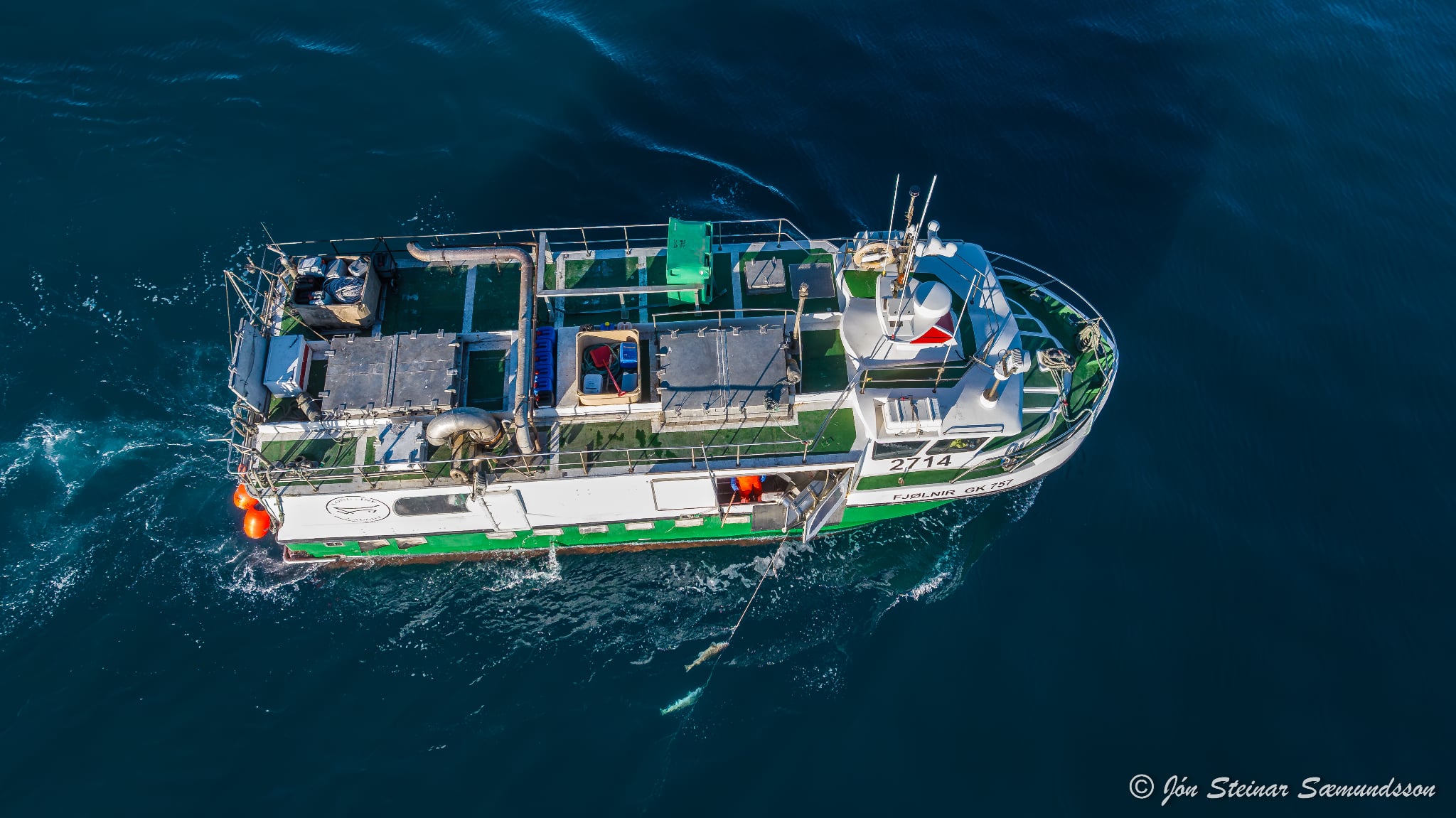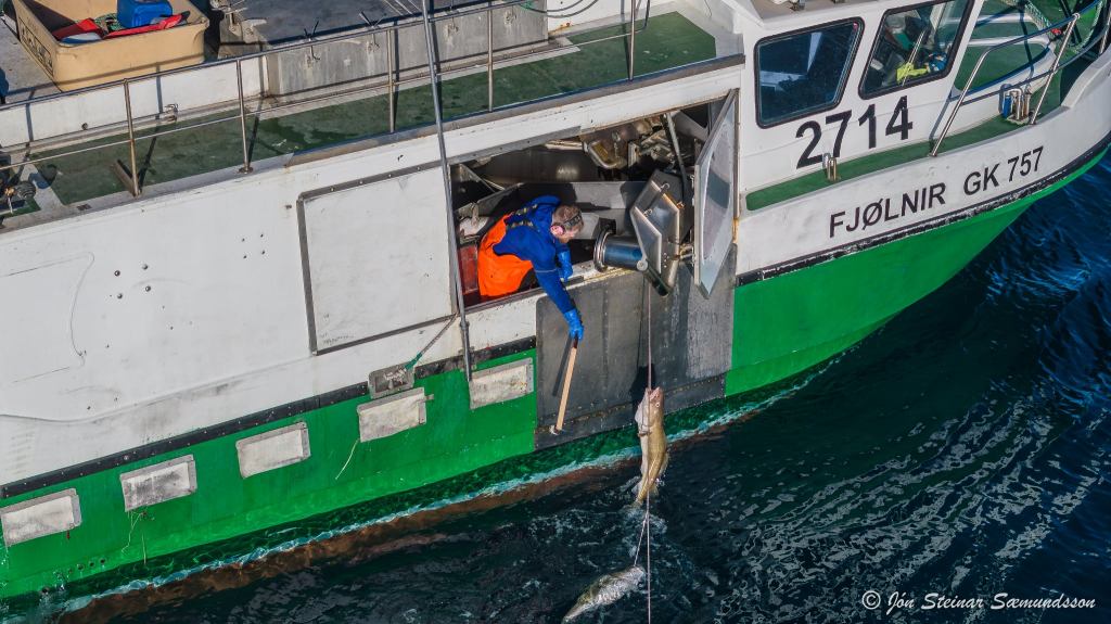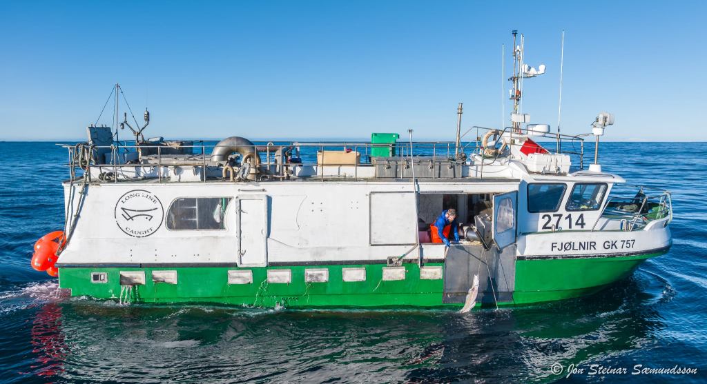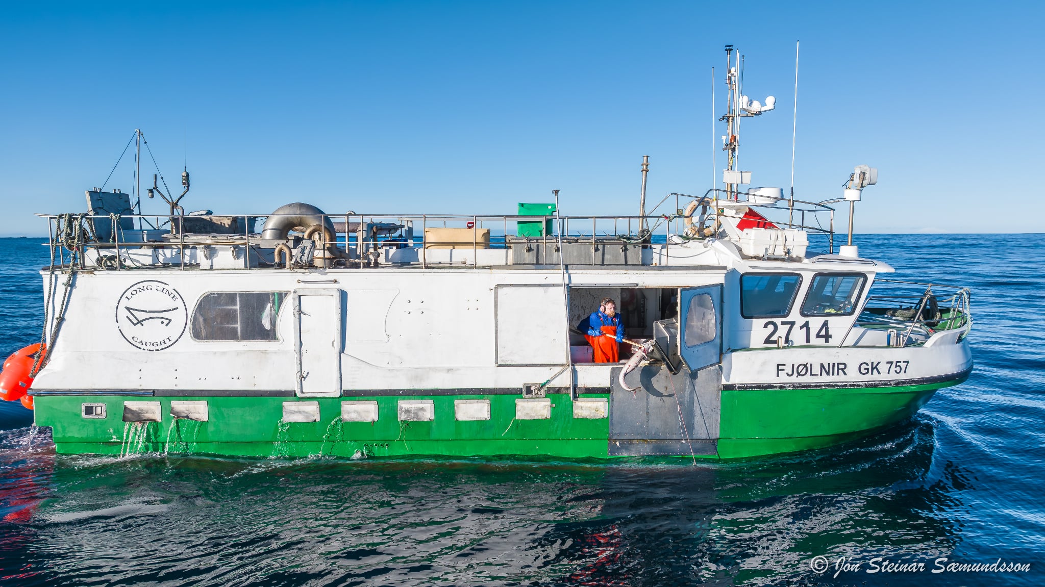 Jón Steinar tók þessar myndir af Fjølni GK 757 í dag þar sem hann var að draga línuna í rjómablíðu út af Stafnesi.