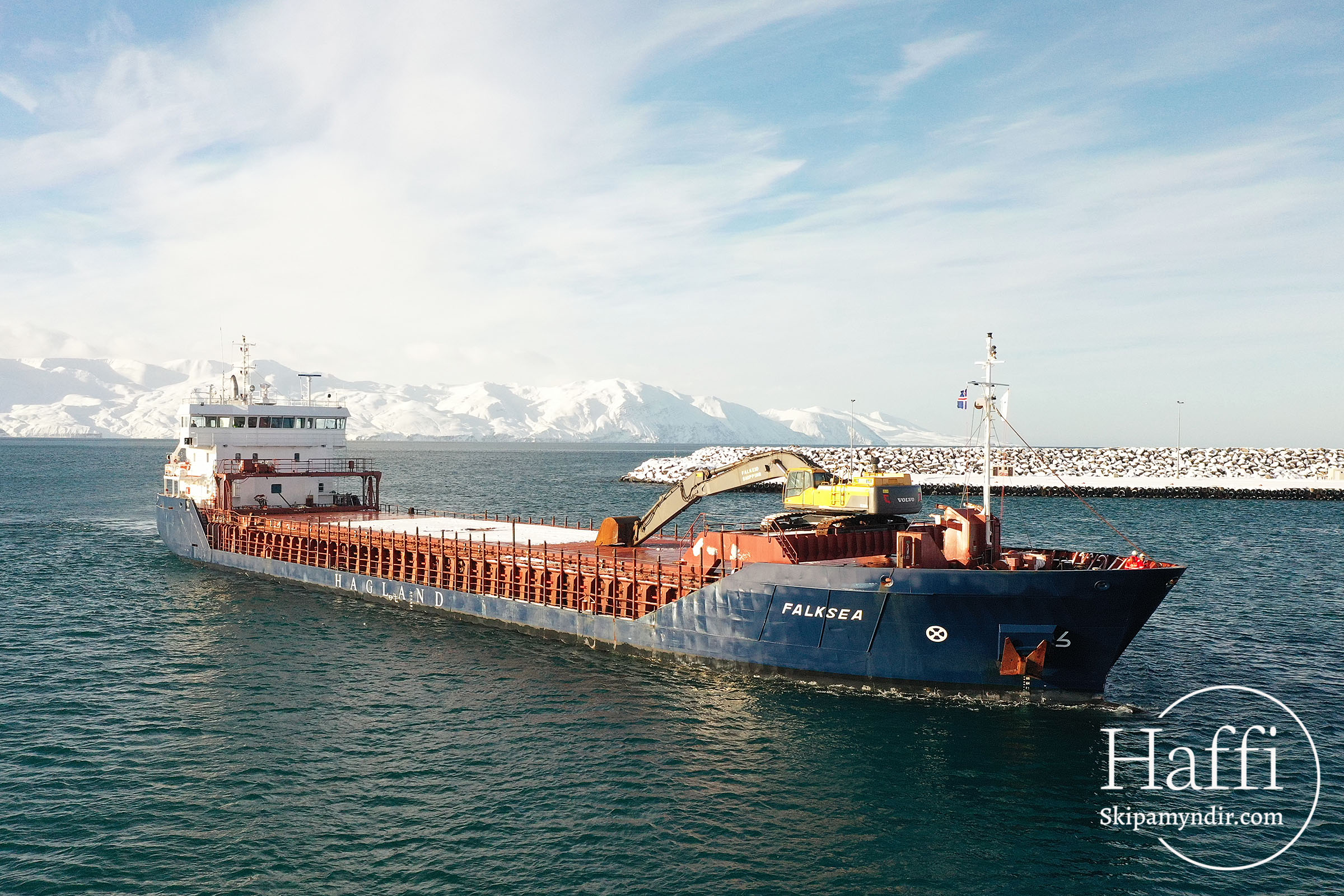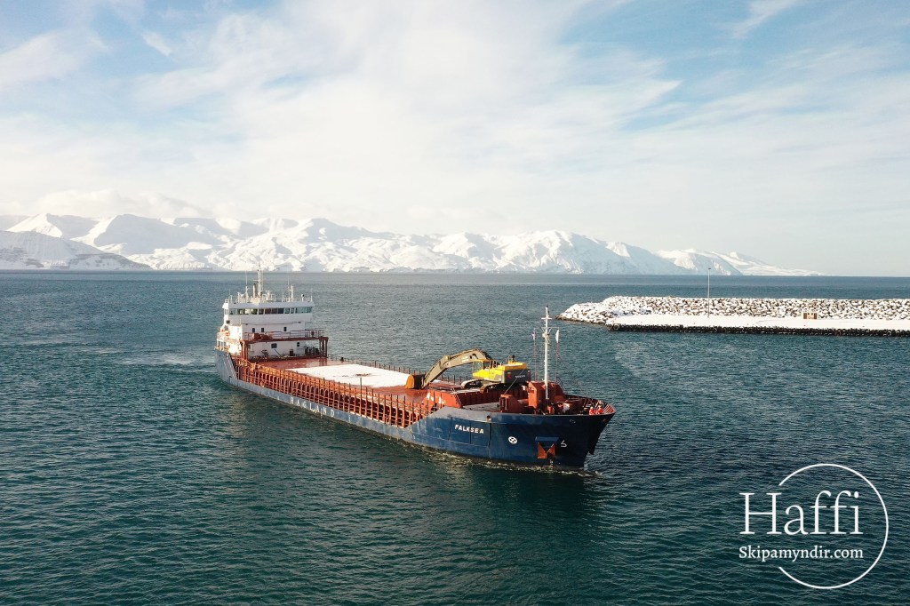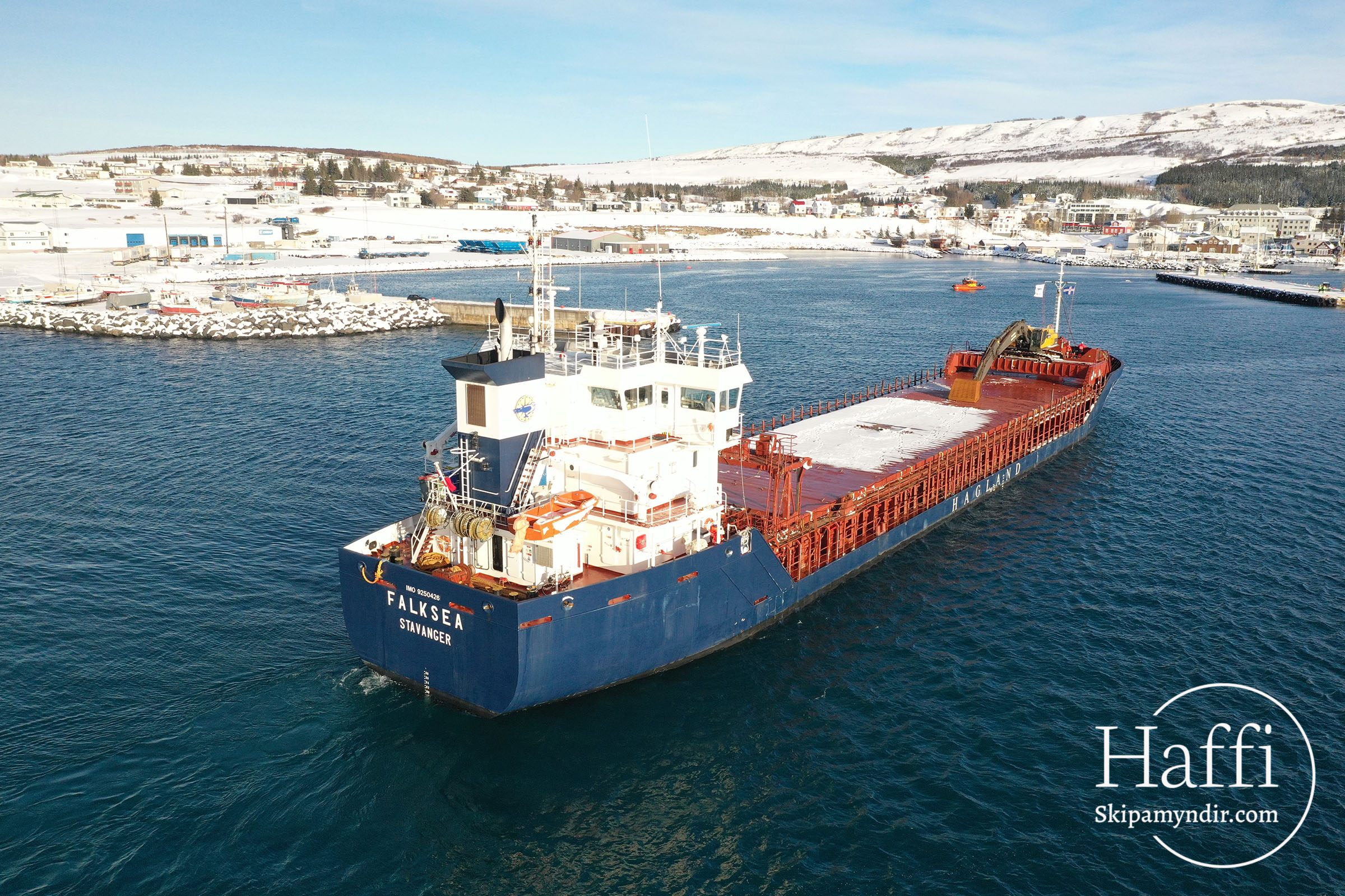 Það bar svo við í dag að það kom flutningaskip til Húsavíkur og er þar á ferðinni hið norska Falksea sem er með saltfarm í lestum sínum.
