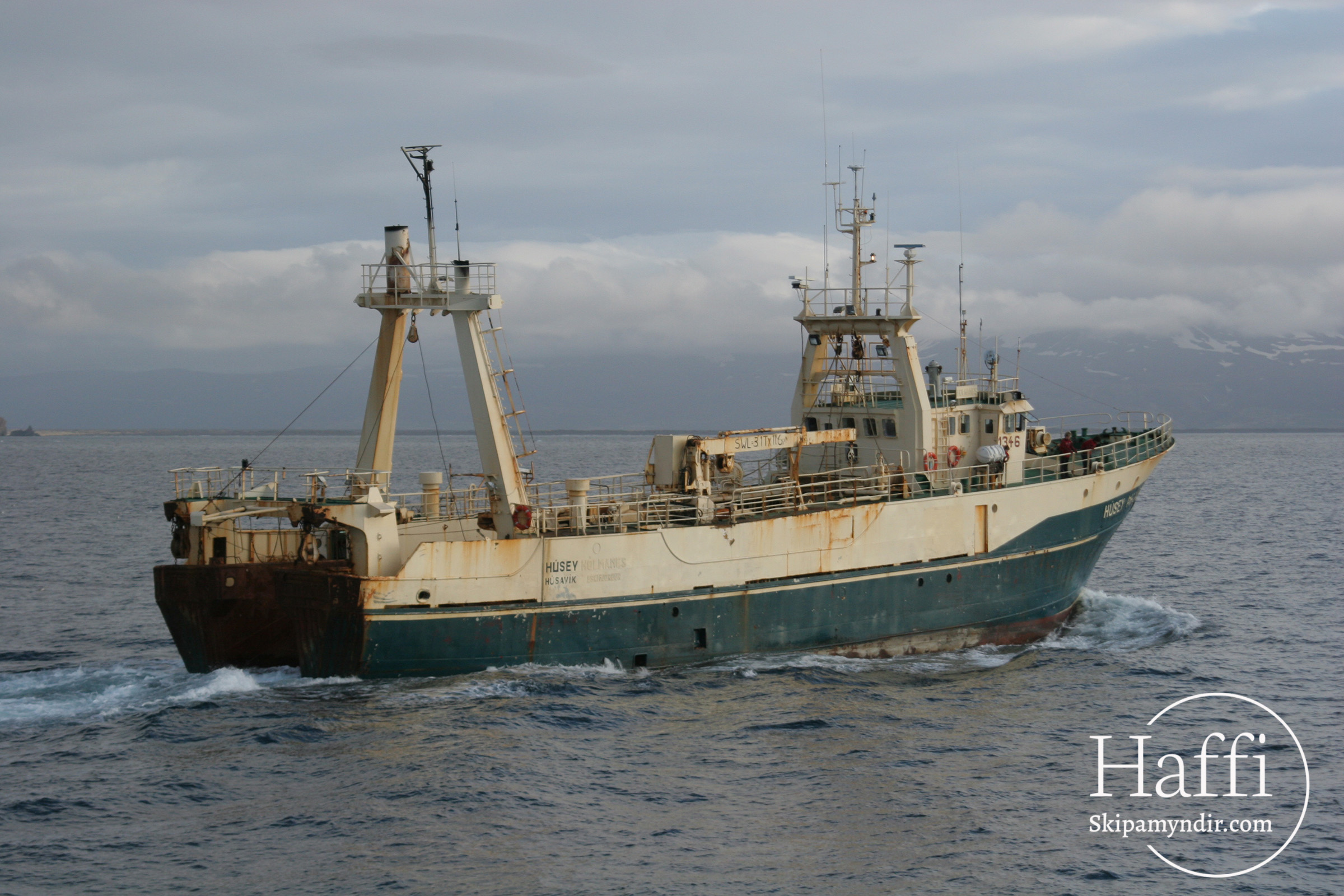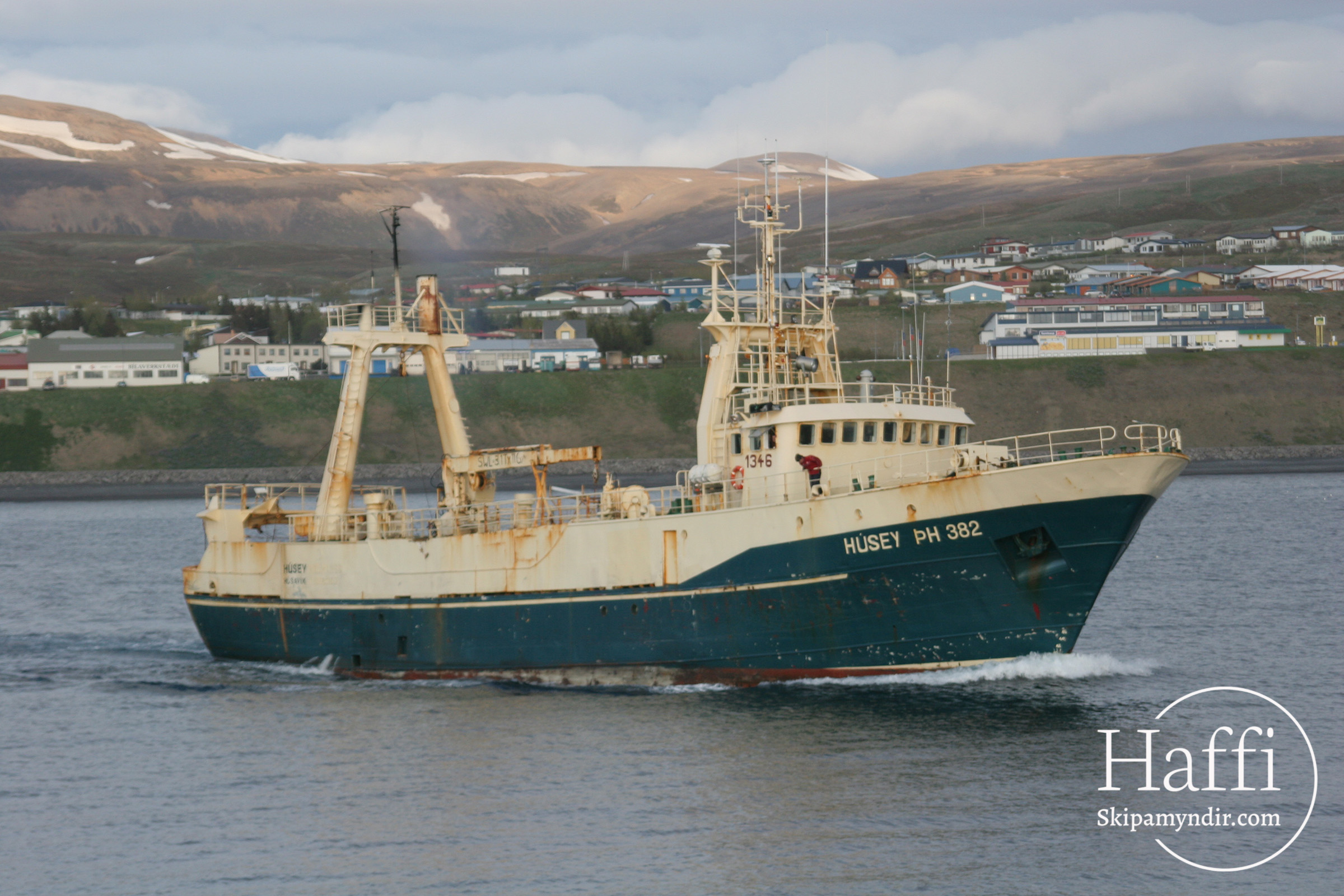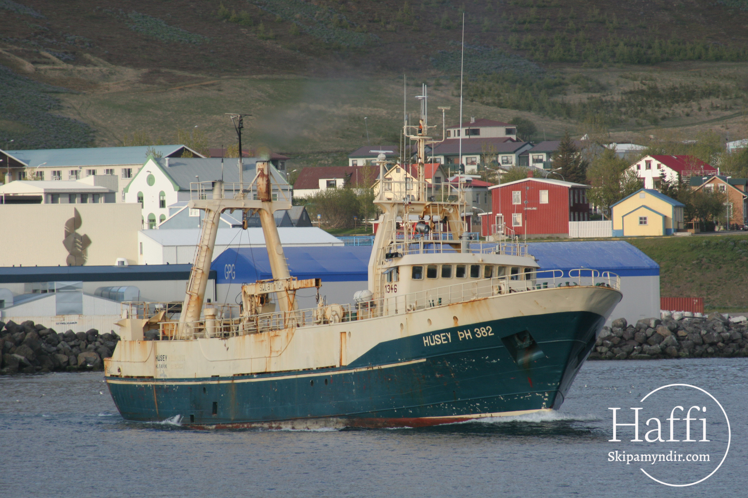 Hér gefur að líta skuttogararnn Húsey ÞH 382 leggja af stað áleiðis til Danmerkur þar sem hann fór í brotajárn. Þetta var snemma í júnímánuð árið 2005.