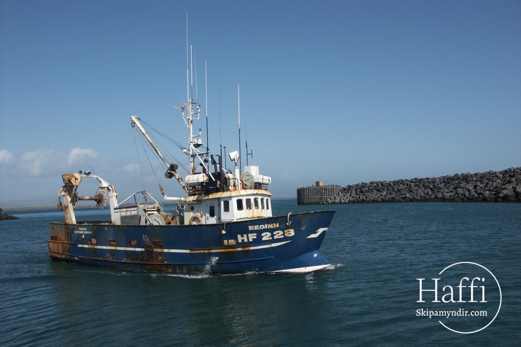 Reginn HF 228 er hér á siglingu innann hafnar í Þorlákshöfn sumarið 2004 en það sama ár fékk hann einkennisstafina ÁR 228.