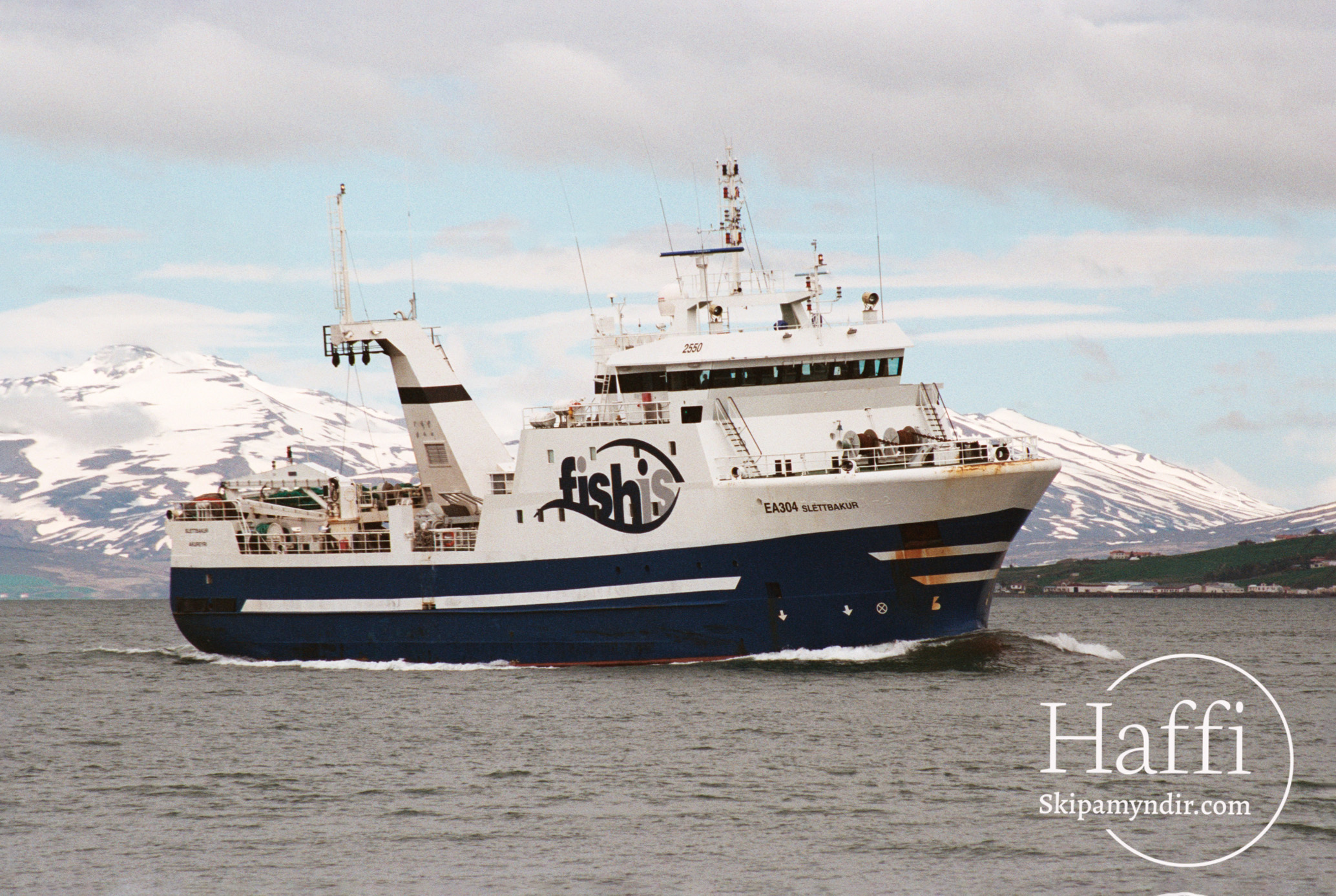 Hér gefur að líta frystitogarann Sléttbak EA 304 á siglingu á Eyjafirði um árið en ÚA keypti hann til landsins í marsmánuði árið 2002.