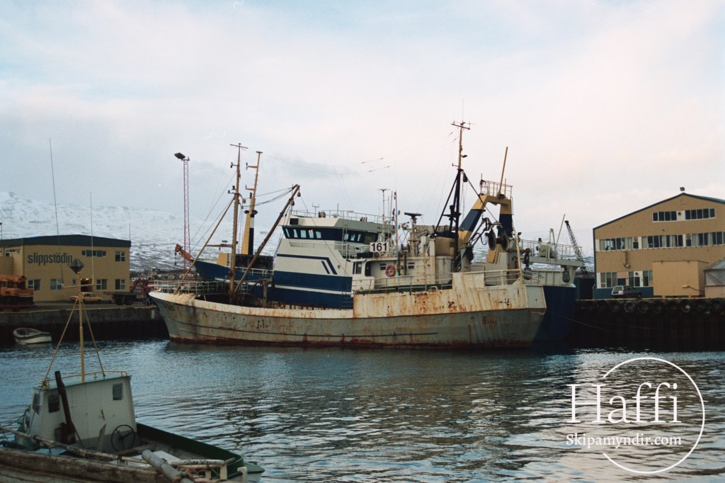 Hér gefur að líta Sólfell EA 640 frá Hrísey þar sem báturinn liggur utan á nýsmíði í Slippnum sem síðar fékk nafnið Bylgja VE 75.